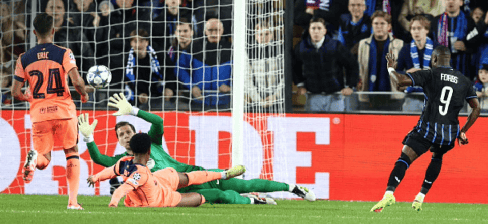 เพียงหกนาทีหลังเริ่มเกม ฟอร์บส์ของบรูจส์จ่ายบอลให้เทรซโซลดีทำประตูแรกของเกม ส่งให้เจ้าบ้านขึ้นนำอย่างรวดเร็ว สองนาทีต่อมา บาร์เซโลน่าโต้กลับอย่างรวดเร็ว เฟร์มินจ่ายบอลให้เฟร์รานยิงตีเสมอ ในนาทีที่ 18 บรูจส์ขึ้นนำอีกครั้งเมื่อซูม่าจ่ายบอลให้ฟอร์บส์ทำประตูในช่วงโต้กลับในนาทีที่ 28 ยามาลของบาร์เซโลนาจ่ายบอลให้คูเด้ ซึ่งโหม่งบอลไปชนเสา ทำให้พลาดโอกาสทองไปอย่างน่าเสียดาย ก่อนหมดครึ่งแรกไม่นาน ยามาลจ่ายบอลทะลุช่องให้เฟร์รานได้โอกาสยิงเดี่ยว แต่เขายิงไม่เข้า เริ่มครึ่งหลังได้เพียง 6 นาที ยามาลก็ทำประตูตีเสมอให้บาร์เซโลนาได้อีกครั้ง แต่ฟอร์บส์ของบรูจส์ก็ยิงประตูให้เจ้าบ้านขึ้นนำอีกครั้งในอีก 3 นาทีต่อมาในนาทีที่ 78 ยามาลบังคับให้ทีมทำเข้าประตูตัวเอง ทำให้บาร์เซโลนาตีเสมอเป็น 3-3 และจบเกมด้วยการเสมอ 3-3 บาร์เซโลนาอยู่ในอันดับสามของกลุ่ม มี 7 คะแนน จาก 2 ชนะ 1 เสมอ และ 1 แพ้ ขณะที่คลับบรูจจ์อยู่ในอันดับสี่ มี 4 คะแนน