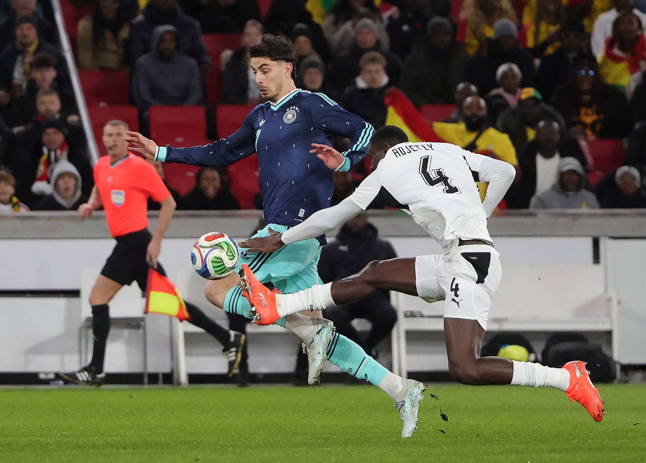 เมื่อวันที่ 30 มีนาคม ผู้เล่นทีมเยอรมัน Havertz (ซ้าย) และผู้เล่นกานา Ajieti ต่อสู้กันในเกม สำนักข่าวซินหัว (ภาพโดย ฟิลิป รุยซ์)