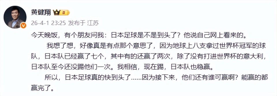 ในบรรดาพวกเขามุมมองของ Huang Jianxiang มีแนวทางที่ชัดเจน: ในความเห็นของเขาทีมญี่ปุ่นชนะทีมที่แข็งแกร่งที่สามารถชนะได้ - ในการแข่งขันฟุตบอลโลก 8 ครั้งญี่ปุ่นเอาชนะได้ 7 ครั้ง แต่ยังไม่ได้แตะอิตาลีที่พลาดฟุตบอลโลกสามครั้งติดต่อกัน และสิ่งที่หวงเจียงเซียงพูดคือเพื่อนที่ถามเขาว่าฟุตบอลญี่ปุ่นจบแล้วหรือยัง การได้เห็นมุมมองดังกล่าวบนอินเทอร์เน็ตนั้นเห็นได้ชัดว่าหมายถึงดงลู เพราะดงลู่ได้กล่าวประเด็นนี้มากกว่าหนึ่งครั้งในการถ่ายทอดสด