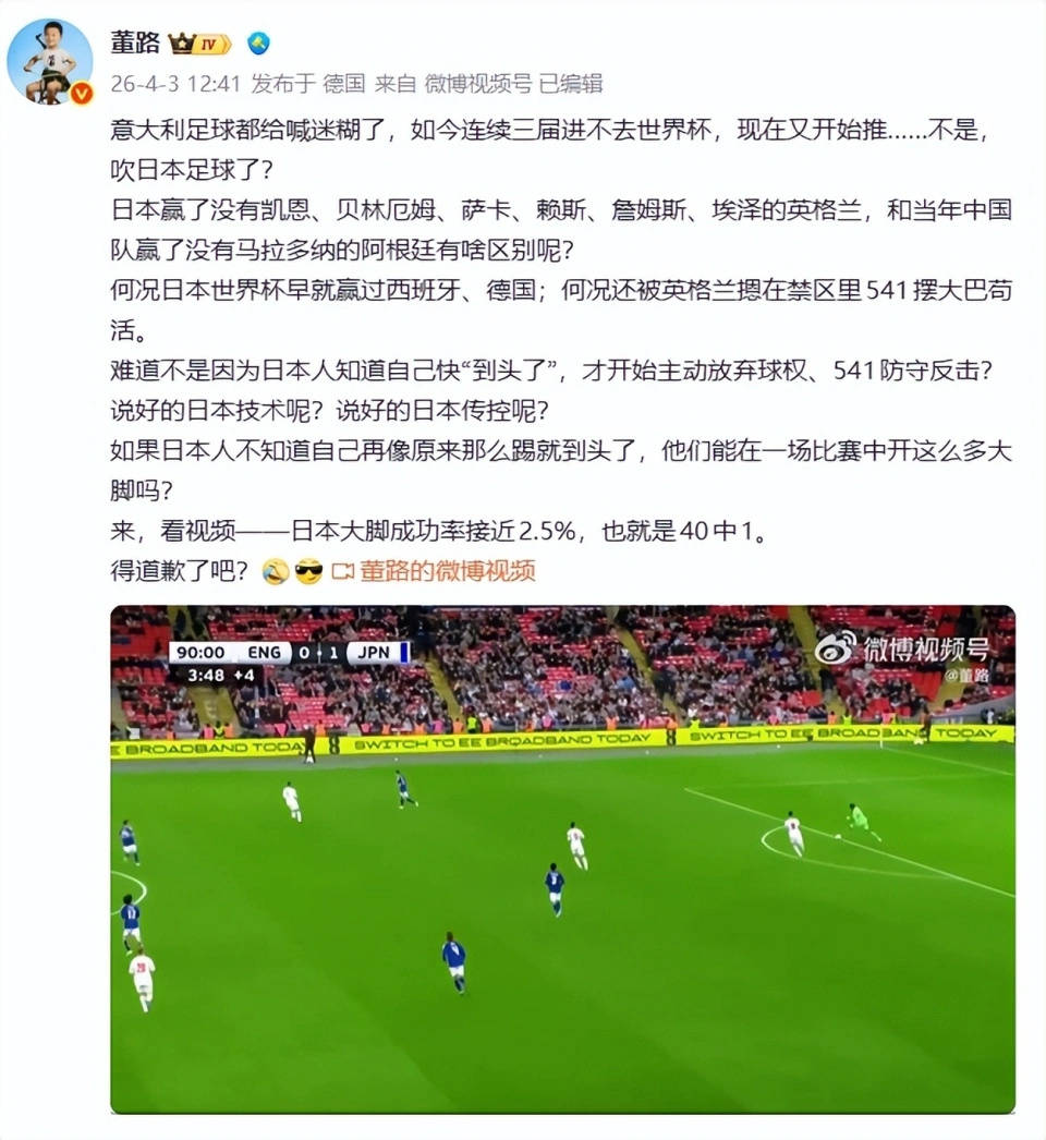 ระหว่างวันนัดทีมชาตินัดที่ผ่านมา ทีมญี่ปุ่น เอาชนะอังกฤษ 1-0 ในเกมเยือน กระตุ้นความสนใจของแฟนบอลทั่วโลกอย่างไม่ต้องสงสัย ในหมู่พวกเขา มันยังทำให้เกิดความรู้สึกอย่างมากในฟุตบอลในประเทศ และยังทำให้เกิดการอภิปรายในแวดวงฟุตบอลในประเทศอีกด้วย ในหมู่พวกเขา มุมมองของ Huang Jianxiang และ Dong Lu นั้นชัดเจนสำหรับททท