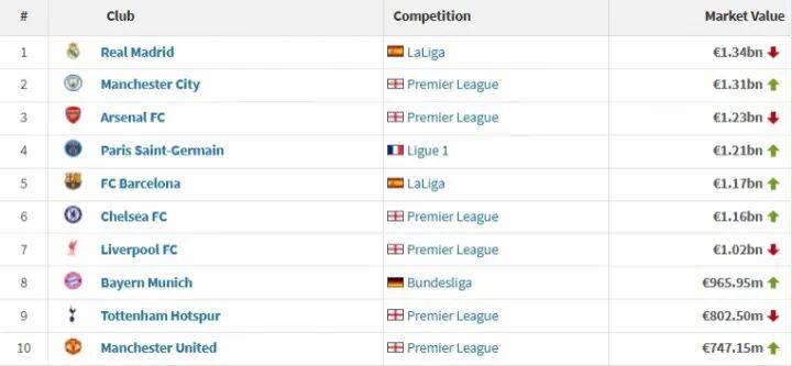 10 สโมสรชั้นนำในยุโรป (หน่วย: EUR) :
