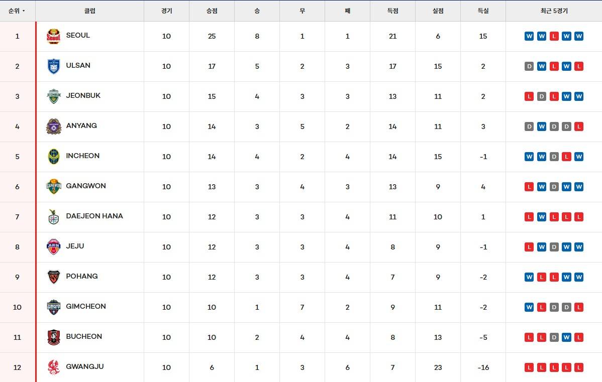 หลังจากรอบนี้ของเกม โซล อุลซาน และจอนบุคได้รับการจัดอันดับให้อยู่ในสามอันดับแรก และหลังจากชัยชนะครั้งใหญ่ของพลเมืองดาเทียน ฮานะ แต้มก็เสมอกับเชจูและโปฮัง และจำนวนประตูได้ท่วมท้นคู่ต่อสู้และขึ้นสู่อันดับที่เจ็ด อย่างไรก็ตาม พวกเขายังอยู่ห่างจากโซลระดับท็อปของกลุ่มแชมป์ 13 แต้ม หลังจากแพ้สตรีคหกเกม กวางจู เอฟซี ยังคงอยู่ด้านล่างสุด ช่องว่างระหว่างพวกเขากับ Bucheon สุดท้ายที่สองต่อท้ายคือ 4 คะแนน หากพวกเขาไม่สามารถปรับสถานะได้ ฉันเกรงว่าพวกเขาจะไม่หนีความหายนะของ Shangwu มาผลักไสในฤดูกาลนี้
