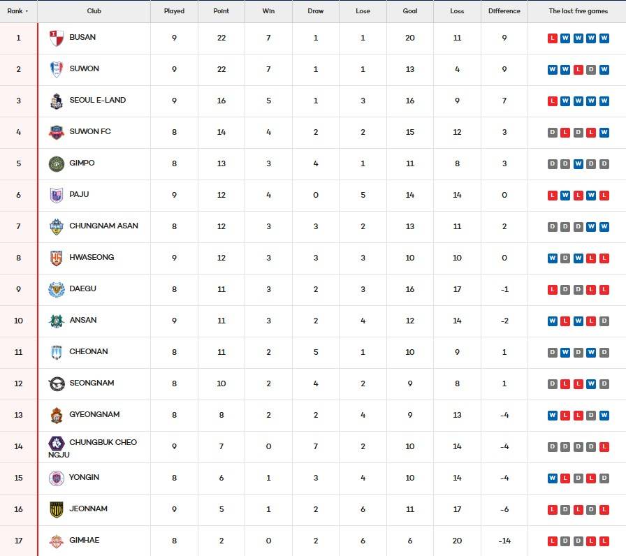 ในอันดับ ปูซาน ไอพาร์ค และซูวอน ซัมซุง เสมอกันด้วยคะแนนสูงสุด 22 แต้ม และปูซานก็ครองอันดับหนึ่งด้วยจำนวนประตูชั่วคราว โซล อีเลียน และ "พลาด" ของซูวอน เอฟซี ทำให้ทั้งสองทีมอยู่ในอันดับสาม (16 แต้ม) และอันดับที่สี่ (14 แต้ม) ชัยชนะครั้งแรกของ Longren FC ยังทำให้พวกเขาแซง Quannan Tianlong ได้สำเร็จและส่งคู่ต่อสู้ไปยังตำแหน่งที่สองต่อสุดท้าย สำหรับ Quannan Tianlong โค้ช Park Donghe บางทีการตัดสินตำแหน่งโค้ชของเขาอาจอยู่ไม่ไกล