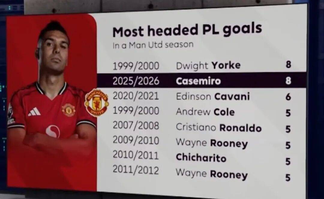 ข้อมูลแสดงให้เห็นว่านี่เป็นครั้งที่ 8 ของ Casemiro ในฤดูกาลนี้ในการทำประตู และเขามีเพียงหนึ่งใน 9 ประตูของเขา ไม่ใช่ลูกโหม่ง สิ่งนี้ผูกสถิติส่วนหัวของแมนเชสเตอร์ยูไนเต็ดในฤดูกาลเดียวเช่นเดียวกับยอร์กในฤดูกาล 1999/2000