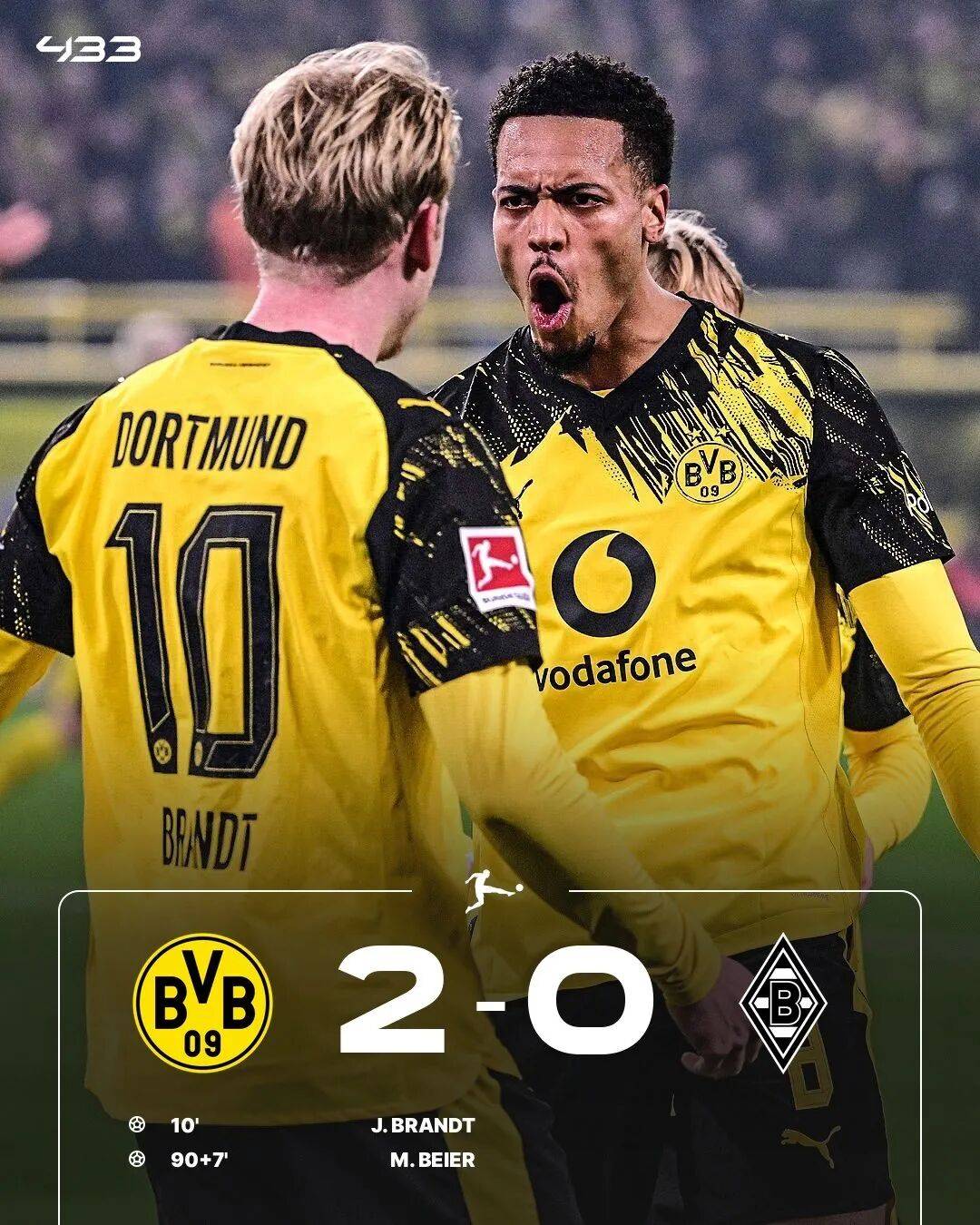 ในครึ่งแรก ซือเล่จ่ายบอลให้บรันด์ตวอลเลย์เข้าประตูไป หลังจากพักครึ่ง แบร์ก็ปิดท้ายชัยชนะในช่วงทดเวลาบาดเจ็บ ทำให้ดอร์ทมุนด์เอาชนะมึนเช่นกลัดบัคไปได้ 2-0