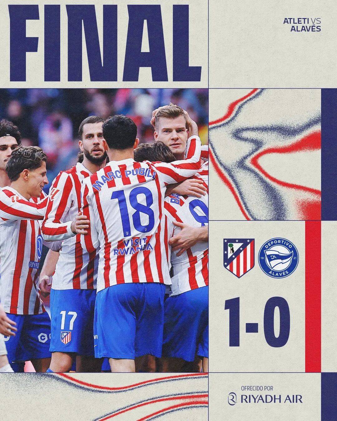 แอตเลติโก มาดริด คว้าชัยชนะ 1-0 ในเกมเยือนเหนือ เดปอร์ติโบ ลา คอรุนญ่า ในศึกโกปา เดล เรย์ เมื่อสัปดาห์ที่ผ่านมา ผ่านเข้าสู่รอบต่อไปได้สำเร็จ รัคคิเอรี และ กรีซมันน์ ต่างยิงบอลชนเสาในครึ่งแรกและครึ่งหลังตามลำดับ ขณะที่กรีซมันน์ทำประตูได้จากการยิงฟรีคิกที่ยอดเยี่ยม แอตเลติโก ครองเกมได้เหนือกว่า และจะพบกับ เรอัล เบติส เพื่อชิงตั๋วเข้าสู่รอบรองชนะเลิศเมื่อสัปดาห์ที่แล้วในการแข่งขันลาลีกาที่บ้าน แอตเลติโก มาดริด คว้าชัยชนะอย่างหวุดหวิด 1-0 เหนืออลาเบส อัลมาราดา, บาร์ริออส และอัลวาเรซ กลับเข้าสู่รายชื่อผู้เล่นตัวจริง ทีมยังคงครองเกมได้อย่างสมบูรณ์ตลอดการแข่งขัน โดยอเล็กซานเดอร์ โซลอธ กองหน้าชาวนอร์เวย์ทำประตูชัยด้วยการโหม่งในครึ่งหลัง ประตูเดียวนี้เพียงพอสำหรับชัยชนะ ทำให้แอตเลติโกอยู่ในอันดับที่สี่ของตารางลีก นำหน้าเอสปันญ่อลที่อยู่ในอันดับที่ห้าอยู่เจ็ดคะแนน
