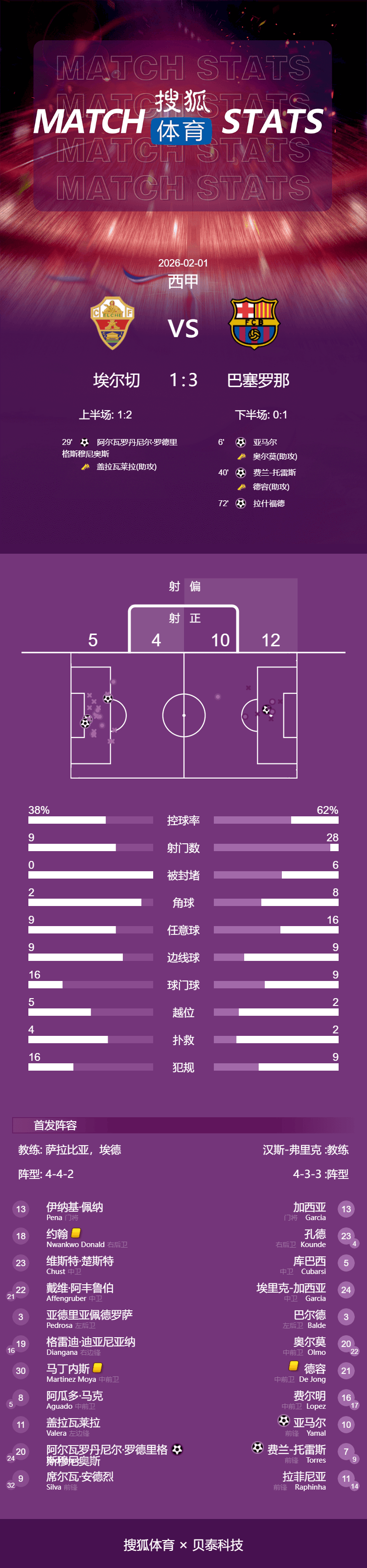 เวลา 04:00 น. ตามเวลาปักกิ่ง วันที่ 1 กุมภาพันธ์ บาร์เซโลนาเดินทางไปยังเอลเชเพื่อเผชิญหน้ากับเอลเชในรอบที่ 22 ของลาลีกาในครึ่งแรก ยามาลช่วยให้บาร์ซ่าขึ้นนำ ก่อนที่ อ. โรดริเกซ จะตีเสมอ เฟร์ราน ตอร์เรส ทำประตูและพลาดโอกาสทำประตูหลายครั้ง ทำให้สกอร์ครึ่งแรกอยู่ที่ บาร์เซโลนา 2-1 เอลเช่ ในครึ่งหลัง แรชฟอร์ด ยืนยันชัยชนะให้กับบาร์ซ่า โดยบาร์เซโลนาชนะเอลเช่ 3-1