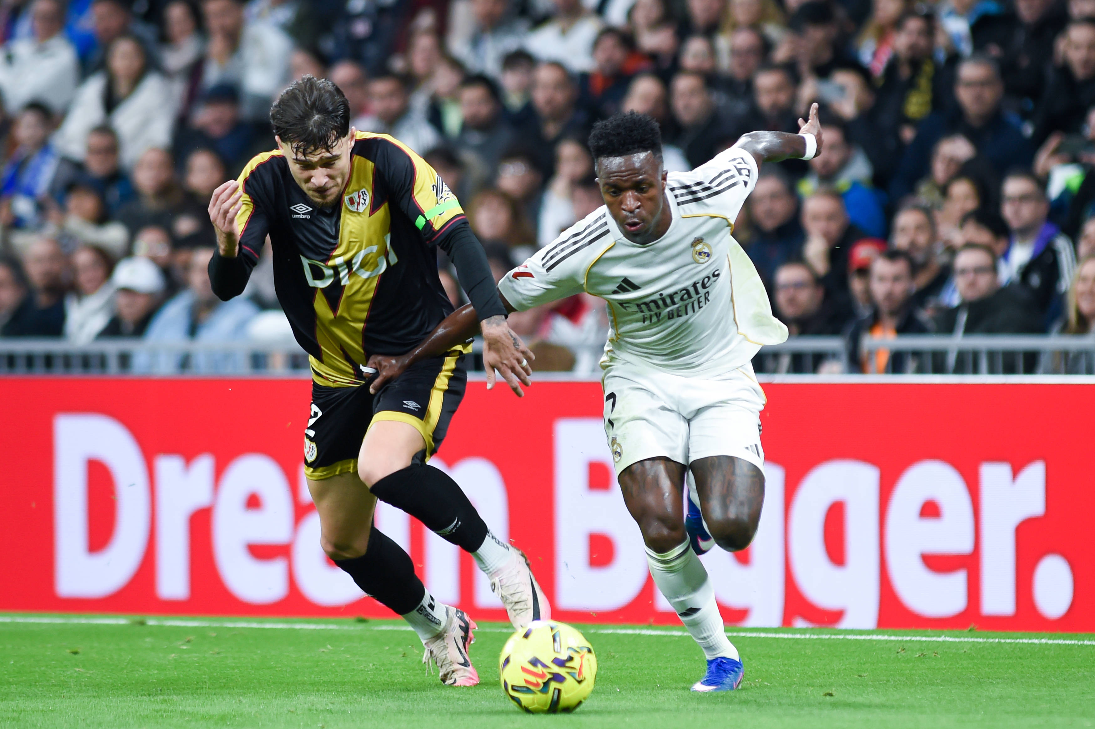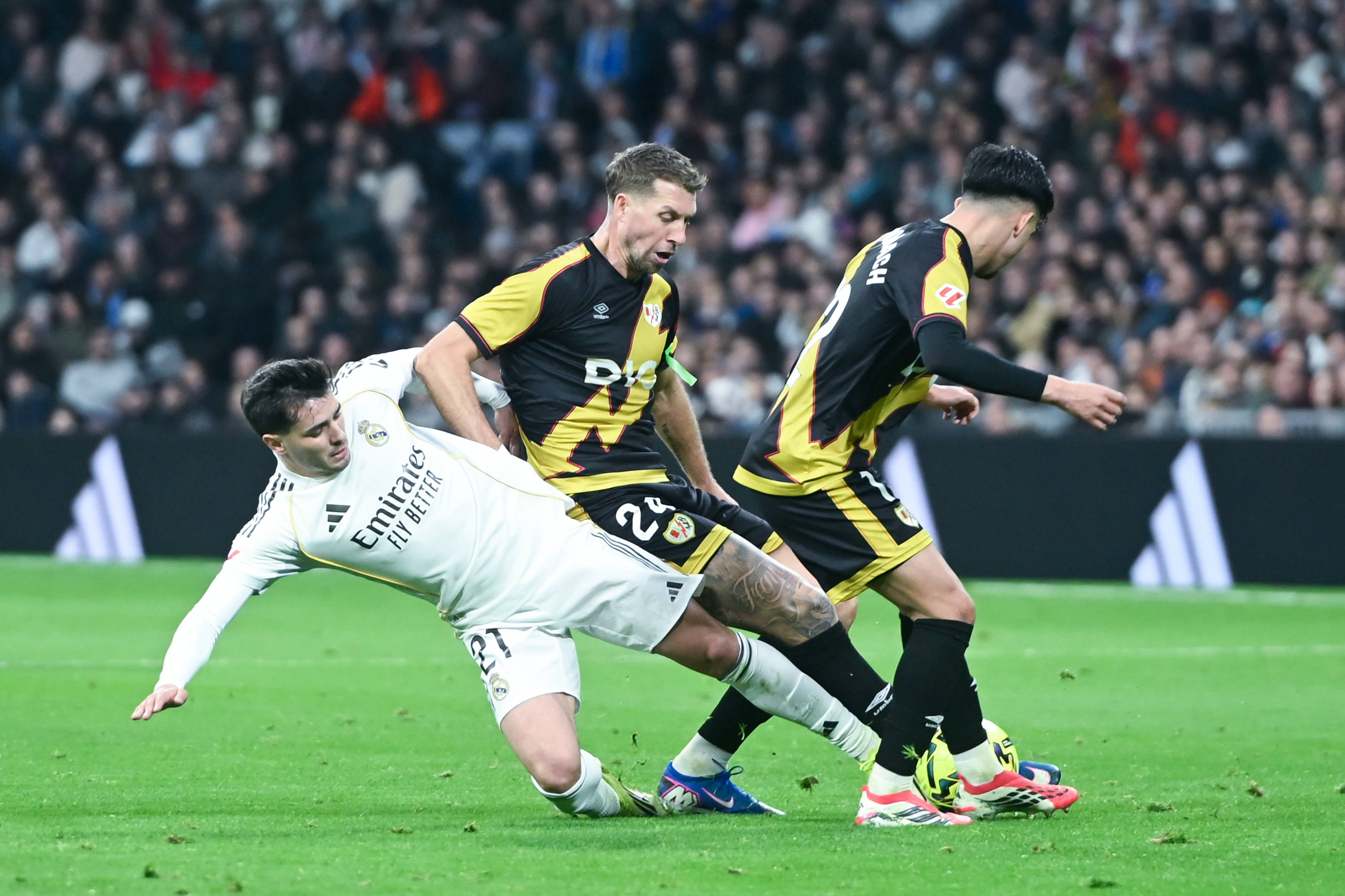 เมื่อวันที่ 1 กุมภาพันธ์ บราฮิม ดิอาซ ของเรอัล มาดริด (ขวา) เข้าปะทะกับ อิลิยาส ของราโย บาเยกาโน เพื่อแย่งบอล สำนักข่าวซินหัว (ภาพโดย กุสตาโว บาร์เรียนโตส)