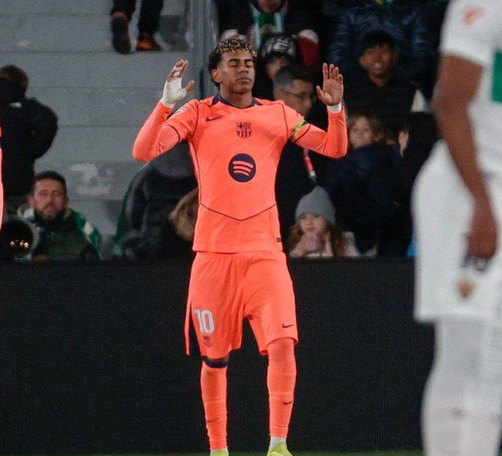 ในช่วงหกนาทีแรก บาร์เซโลนาเป็นฝ่ายทำประตูขึ้นนำก่อน ด้วยการเล่นเชิงกลยุทธ์ที่ซับซ้อนทะลวงแนวรับของเอลเช่ โอลโม่ส่งบอลอย่างแม่นยำจากบริเวณเส้นกลางสนาม เป็นบอลทะลุช่องที่เฉียบคมราวกับใบมีด ยามาลวัย 18 ปี อ่านจังหวะได้อย่างสมบูรณ์แบบ วิ่งตัดหน้าแนวรับทันจังหวะพอดี หลุดล้ำหน้าไปอย่างเฉียบขาด ก่อนจะเลี้ยงบอลหลบผู้รักษาประตูที่วิ่งออกมาอย่างว่องไว แล้วแตะบอลเข้าไปตุงตาข่ายอย่างใจเย็นเป้าหมายนี้ไม่เพียงแต่ทำให้บาร์เซโลนาได้เริ่มต้นอย่างฝันเท่านั้น แต่ยังทำให้ยามาลทำสถิติเทียบเท่ากับคีเลียน เอ็มบัปเป้ ที่ทำประตูได้ 23 ประตูในลีกใหญ่ของยุโรปก่อนอายุ 19 ปีอีกด้วย ดาวรุ่งที่มีมูลค่า 200 ล้านยูโรคนนี้อยู่ในฟอร์มที่ยอดเยี่ยมมากในระยะหลัง โดยทำประตูได้ 4 ประตูและแอสซิสต์ 2 ครั้งใน 5 นัดล่าสุด และฉายแววความยอดเยี่ยมออกมาอย่างต่อเนื่อง