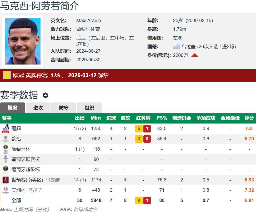 แม็กซี่ อเราโญ อายุ 25 ปี สูง 1.79 เมตร เป็นผู้เล่นถนัดเท้าซ้าย โดยสามารถเล่นได้หลายตำแหน่งในฝั่งซ้ายเป็นหลัก ปัจจุบันเขาอยู่ภายใต้สัญญากับ สปอร์ติ้ง ซีพี จนถึงปี 2029 และมีมูลค่าประเมินจาก Transfermarkt อยู่ที่ 22 ล้านยูโรในฤดูกาลนี้ เขาได้ลงเล่นใน 29 นัดทุกรายการ ทำประตูได้ 5 ประตู และแอสซิสต์ 3 ครั้ง เขาเป็นแบ็กซ้ายที่มีทักษะการโจมตีสูง และยังเป็นนักเตะทีมชาติอุรุกวัยอีกด้วย โดยได้ลงเล่นให้ทีมชาติ 26 นัด ทำประตูได้ 3 ประตู และแอสซิสต์ 9 ครั้ง