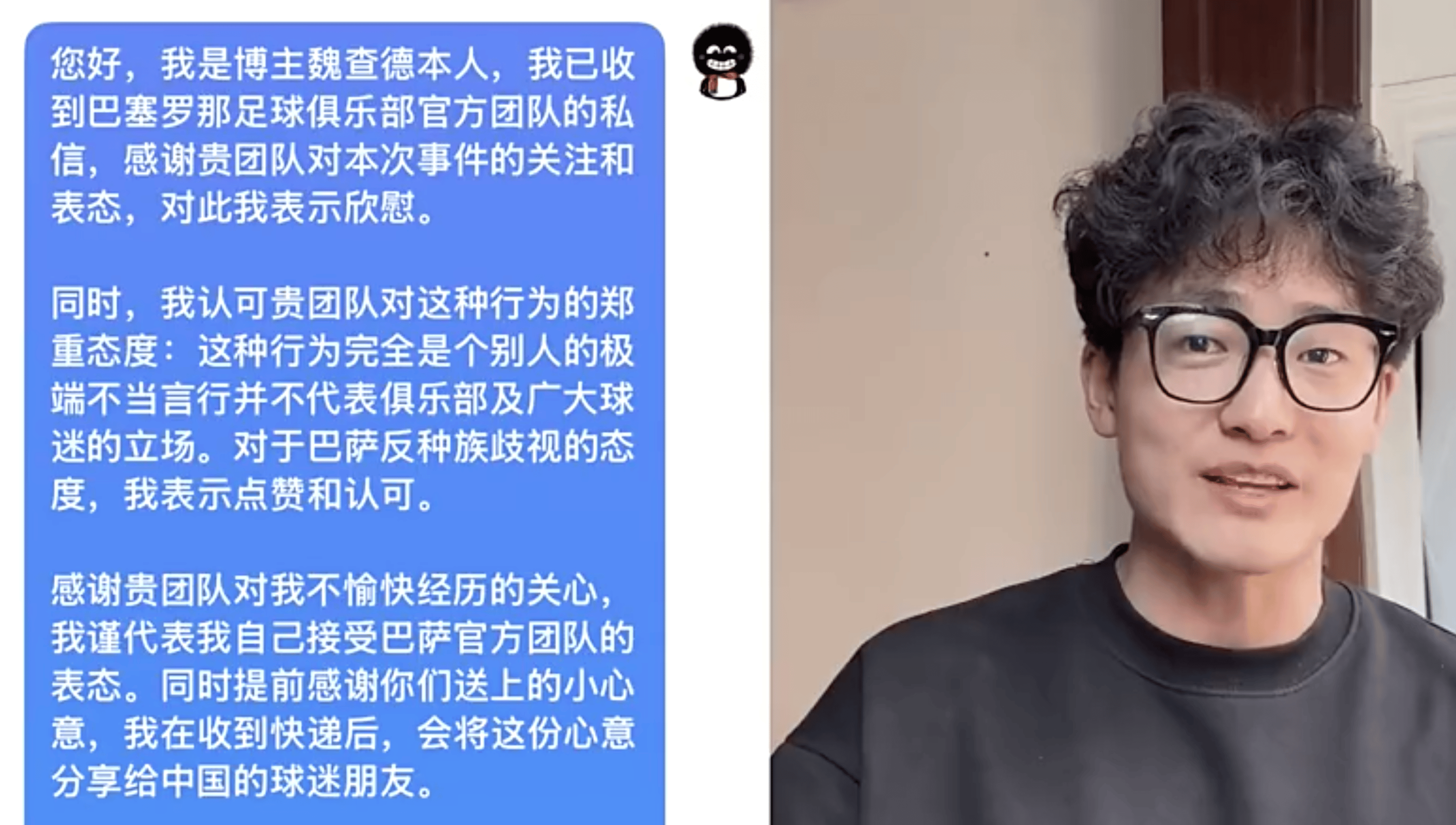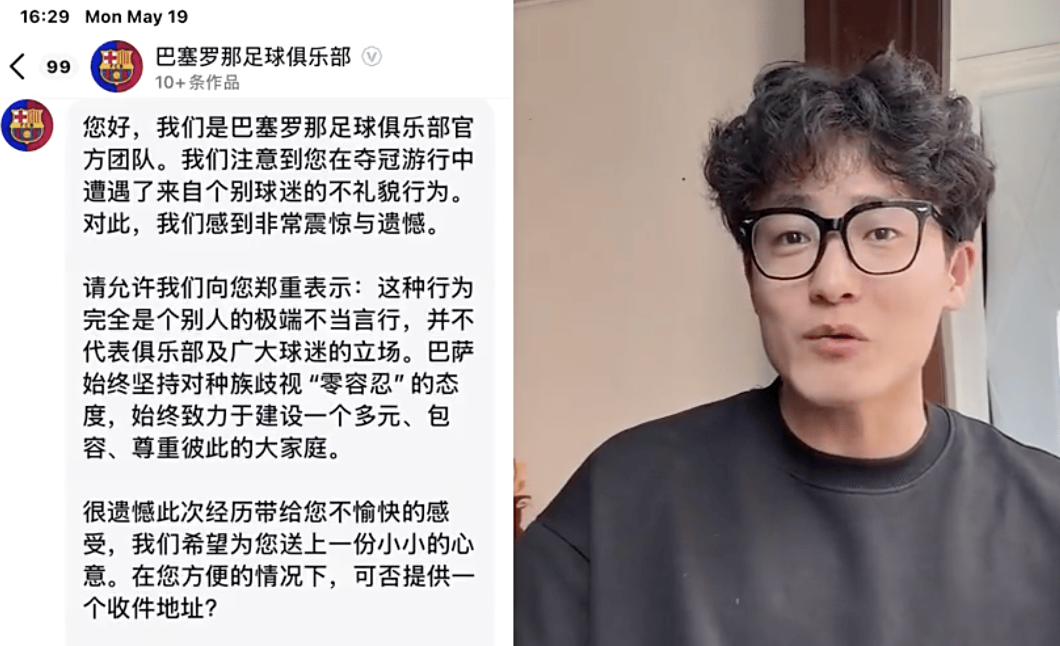 แฟนบอลจีนถูกเลือกปฏิบัติทางเชื้อชาติในสเปนเมื่อปีที่แล้ว; เจ้าหน้าที่บาร์เซโลนาขอโทษผ่านข้อความส่วนตัวและส่งของขวัญไปให้สองวันต่อมา_เรอัล มาดริด_แชมเปียนส์ลีก_บาร์เซโลนา