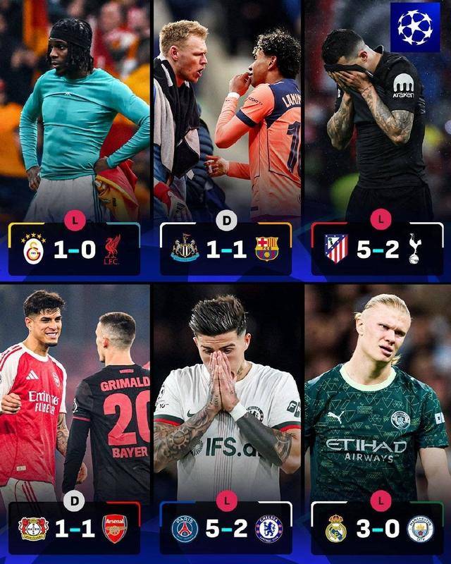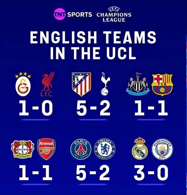 ก่อนอื่นมาดูแชมเปี้ยนส์ลีก ลิเวอร์พูลแพ้ 0-1 ให้กาลาตาซาราย ท็อตแน่ม แพ้ 2-5 ให้กับแอตเลติโก นิวคาสเซิล 1-1 โดย บาร์เซโลน่า อาร์เซนอล 1-1 เลเวอร์คูเซ่น เชลซี แพ้ 2-5 ปารีส แมนเชสเตอร์ ซิตี้ 0-3 กวาดโดย เรอัล มาดริด