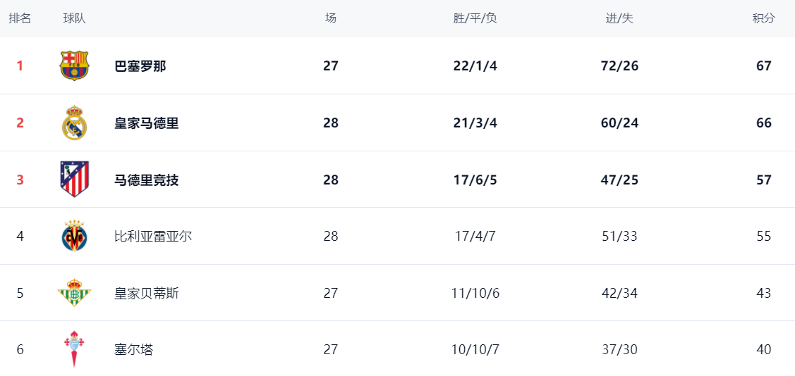 ในอันดับ บาร์เซโลน่ายังคงติดอันดับสูงสุดด้วยสถิติชนะ 22 ครั้ง แพ้ 1 ครั้ง และแพ้ 4 ครั้ง และทำคะแนนได้ 67 แต้ม หลังจากเรอัล มาดริด ชนะ คะแนนรวมถึง 66 แต้ม ตามหลัง บาร์เซโลน่า เพียง 1 แต้ม อันดับสอง อย่างไรก็ตาม เรอัล มาดริด ลงเล่นมากกว่าบาร์เซโลน่าถึง 1 เกม เห็นได้ชัดว่าบาร์เซโลนายังคงใช้ความคิดริเริ่มที่จะคว้าแชมป์ หลังจากแอตเลติโกชนะเกม คะแนนรวมถึง 57 คะแนน อันดับที่สาม บียาร์เรอัลอยู่อันดับที่ 4 ด้วยคะแนน 55 ที่ห้าคือ Royal Betis ซึ่งได้เพียง 43 แต้ม โดยพื้นฐานแล้วเป็นไปไม่ได้ที่จะปรับปรุงอันดับต่อไป