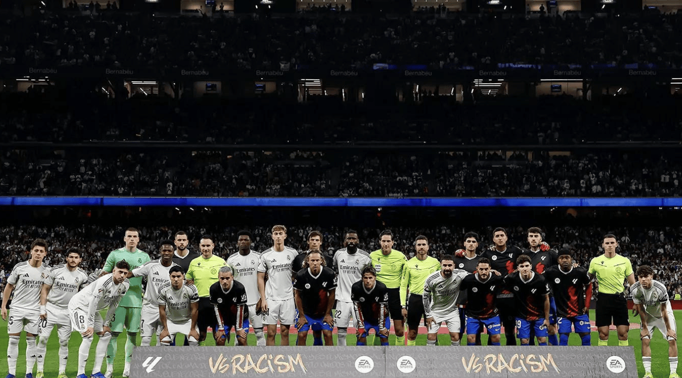 วันนี้เบอร์เนย์ใกล้จะเต็มแล้ว ภายใต้ความสนใจของผู้คน 80,000 คน เรอัล มาดริด ได้ติดป้ายต่อต้านการเหยียดเชื้อชาติในสนามก่อนเกม ผู้เล่นและผู้ตัดสินของเรอัล มาดริด และแอตเลติโก มาดริด ได้ถ่ายภาพหมู่ก่อนป้าย ป้ายระบุว่า "เทียบกับการเหยียดเชื้อชาติ (การเลือกปฏิบัติทางเชื้อชาติของสัตวแพทย์)"