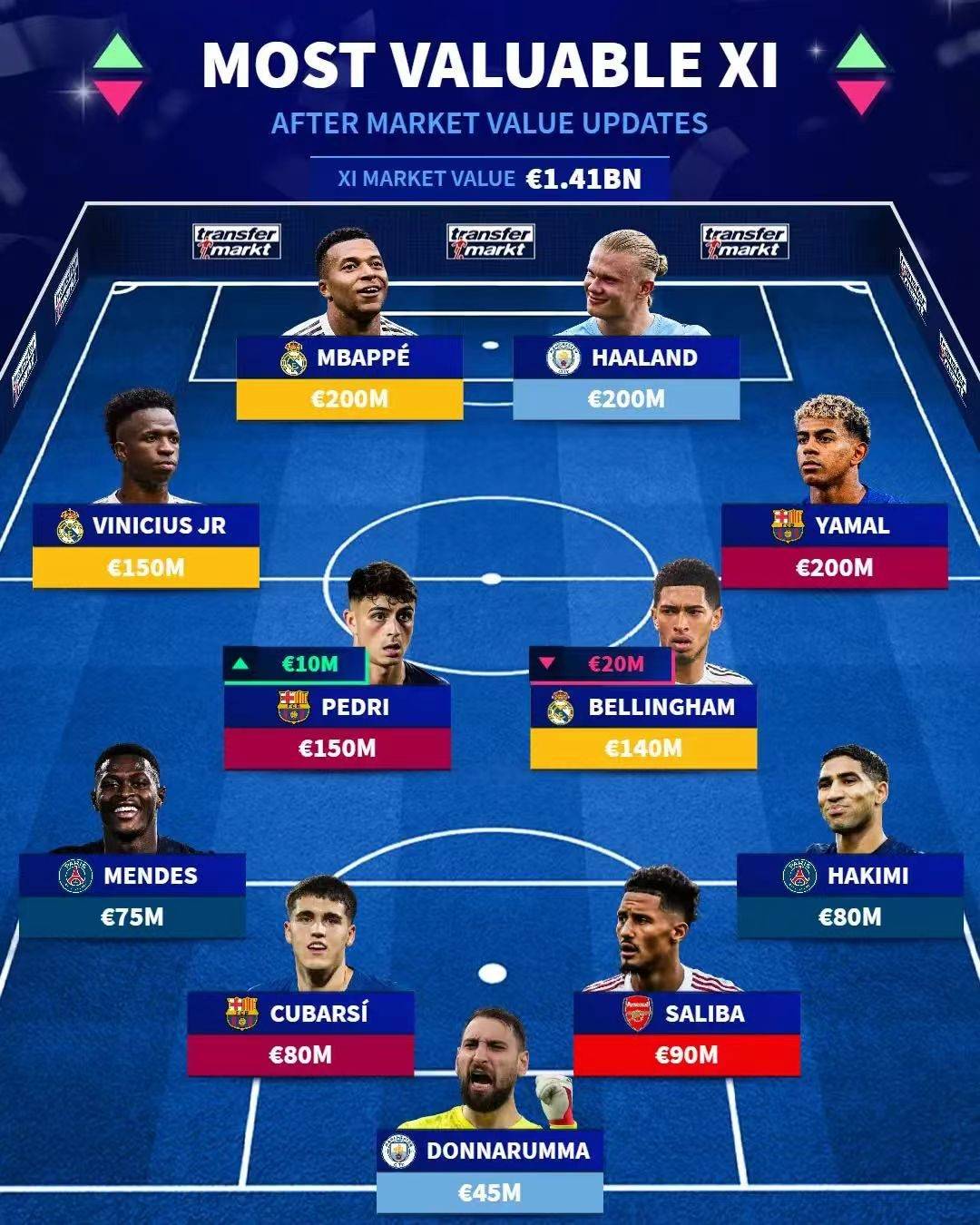 เมื่อวันที่ 30 มีนาคม ตามเวลาปักกิ่ง ตลาดซื้อขายนักเตะของเยอรมันได้อัพเดตอันดับความคุ้มค่าของนักฟุตบอลในปัจจุบัน ในการจัดอันดับนี้ Yamal, Haland และ Mbappe ทั้งหมดเสมอกันที่อันดับสูงสุดของการจัดอันดับด้วยเงิน 200 ล้านยูโร ในขณะที่ Messi และ Cristiano Ronaldo ซึ่งทุกคนกังวลมากกว่า ไม่ปรากฏใน 50 อันดับแรกของรายการนี้