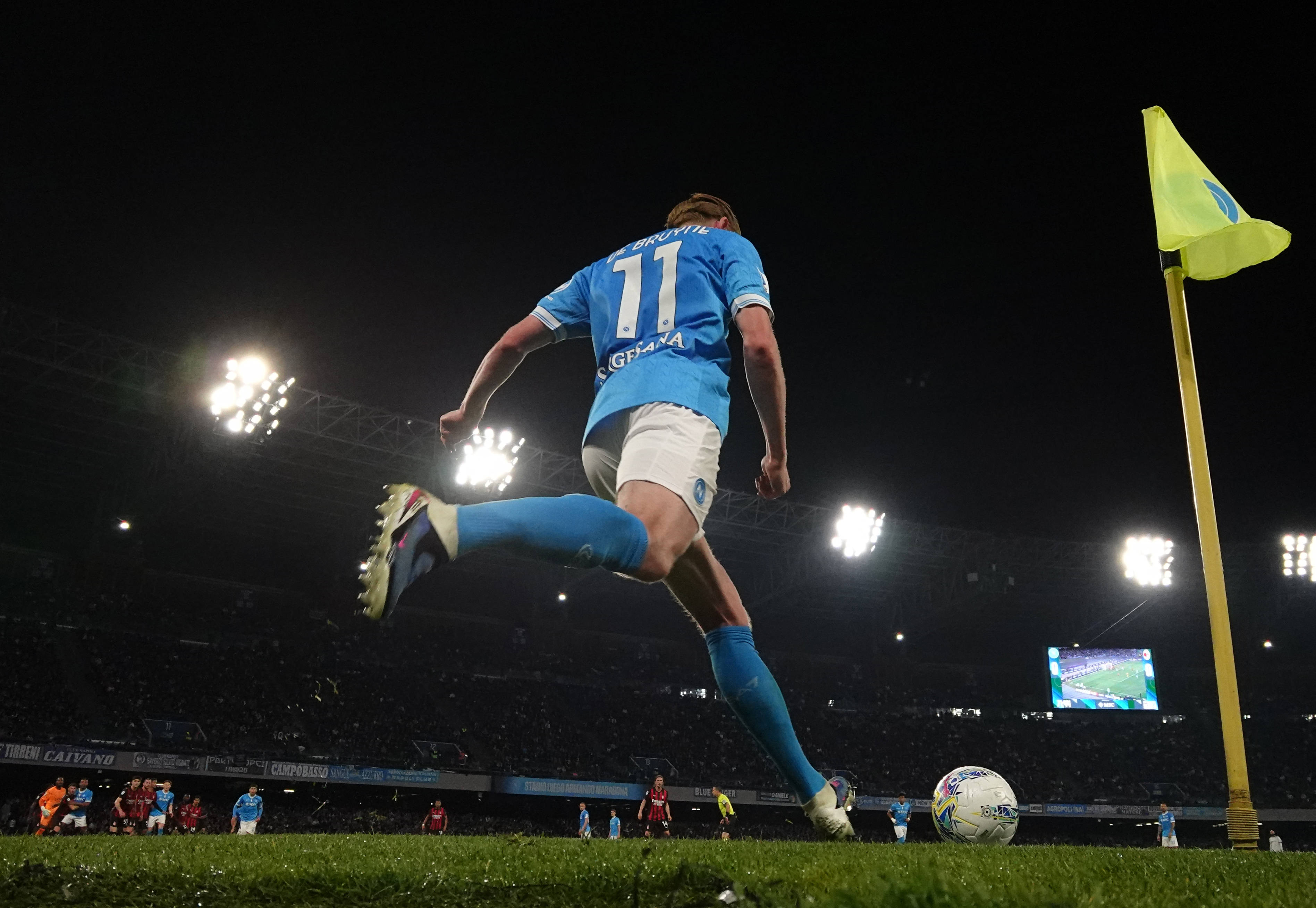 นักเตะเนเปิลส์ เดอ บรอย เมื่อวันที่ 6 เมษายน เตะมุมในเกม สำนักข่าวซินหัว (ภาพโดย Alberto Linglia)