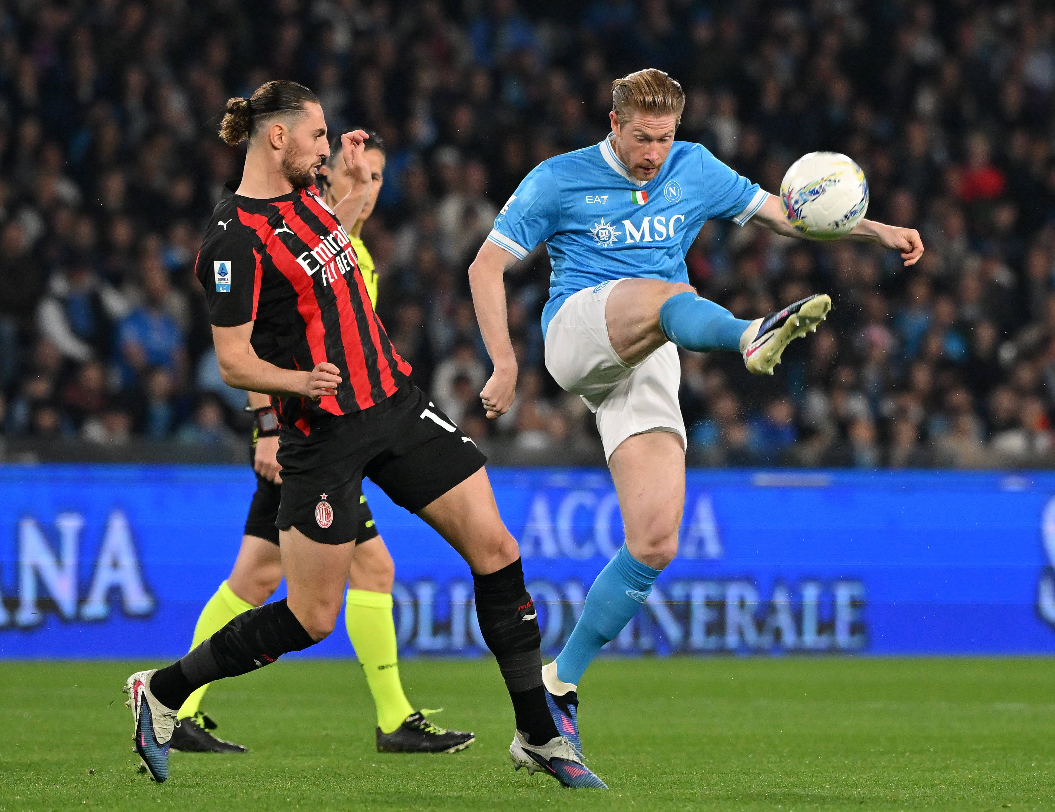 ผู้เล่น Naples De Bruyne ในวันที่ 6 เมษายน ต่อสู้กับ Rabio ผู้เล่น AC Milan ในเกม สำนักข่าวซินหัว (ภาพโดย Alberto Linglia)