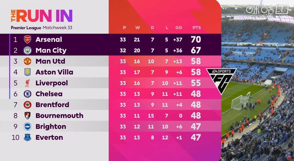 ด้วยการที่แมนฯซิตี้เอาชนะ อาร์เซนอล 2-1 รอบนี้ รูปแบบแชมป์พรีเมียร์ลีกในฤดูกาลนี้ได้กลับมาสู่รูปแบบใหม่ของเกมคู่มังกรคู่ แมนเชสเตอร์ ซิตี้ ตามหลัง อาร์เซนอล 3 แต้ม และเสียประตูน้อยกว่า 1 ประตูในเกม หากแมนเชสเตอร์ ซิตี้ เอาชนะทีมเบิร์นลีย์ โซนที่ถูกผลักไสในช่วงกลางสัปดาห์นี้ พวกเขาคาดว่าจะแซงอาร์เซนอลเพื่อขึ้นสู่อันดับต้น ๆ ของพรีเมียร์ลีก