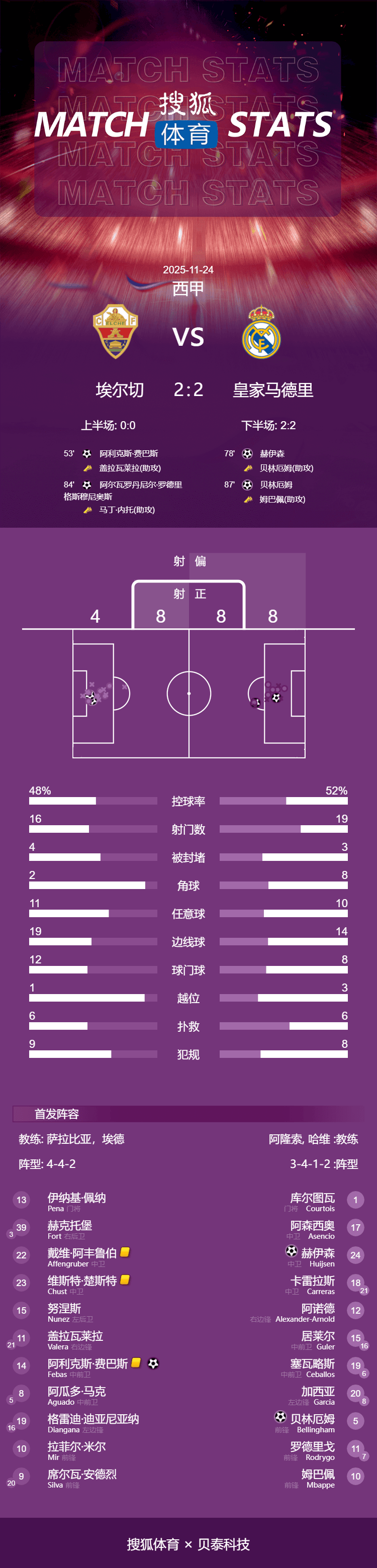 เวลา 04:00 น. ตามเวลาปักกิ่ง วันที่ 24 พฤศจิกายน การแข่งขันนัดสำคัญในรอบที่ 13 ของฤดูกาลลาลีกา 2025-2026 เรอัล มาดริด เดินทางไปเยือนเอลเช่ ในครึ่งแรก คีเลียน เอ็มบัปเป้ พยายามยิงประตูแบบตัวต่อตัว แต่ถูกผู้รักษาประตู ดาบิด เปญา ป้องกันไว้ได้ในครึ่งหลัง บาเลราทำแอสซิสต์ด้วยส้นเท้าให้กับเฟวาสเปิดสกอร์ขึ้นนำ เรอัล มาดริดตีเสมอได้จากไฮเซนจากลูกเตะมุม จากนั้นเนโต้จ่ายให้อัลบาโร่ขึ้นนำอีกครั้ง แต่เอ็มบัปเป้ก็แอสซิสต์ให้เบลลิงแฮมยิงตีเสมอให้ราชันชุดขาว หมดเวลาการแข่งขันเสมอกัน 2-2 ทำให้เรอัล มาดริดไม่ชนะใครติดต่อกันเป็นนัดที่สามในทุกรายการ และลดช่องว่างคะแนนนำในลาลีกาเหลือเพียงหนึ่งแต้ม