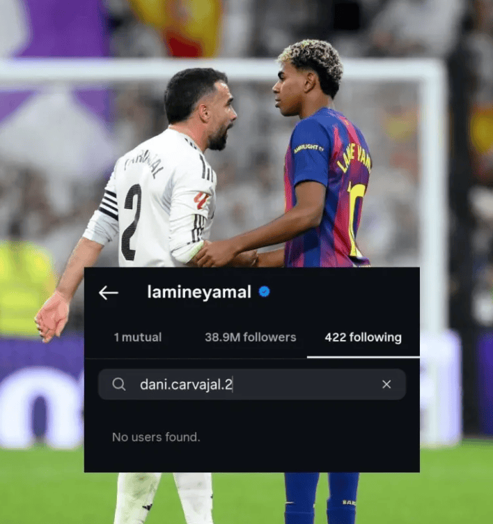 แฟนบอลชาวสเปนต่างตกตะลึงเมื่อเลื่อนดูฟีด Instagram ของยามาล – ชื่อของกัปตันทีมชาติ คาร์บาฆาล ได้หายไปจากรายชื่อผู้ติดตามของเขาแล้ว อย่างที่ทุกคนทราบกันดีว่า ในเกมเอล กลาซิโก เมื่อไม่นานมานี้ ยามาลได้แสดงท่าทีไม่พอใจต่อคาร์บาฆาลซึ่งเป็นทั้งรุ่นพี่และกัปตันทีมโดยตรงหลังจากการแข่งขันดาร์บี้ คาร์บาฆาลได้เข้าไปหาเขาเพื่อพูดว่า "คุณต้องเคารพคู่แข่งของคุณ" แต่เพื่อนร่วมทีมรุ่นพี่กลับเลิกติดตามเขาในโซเชียลมีเดีย สิ่งที่น่ากังวลยิ่งกว่านั้นคือการเลิกติดตามนี้ดูเหมือนจะเป็นการกระทำที่จงใจเพื่อกดดันทีมชาติสเปน