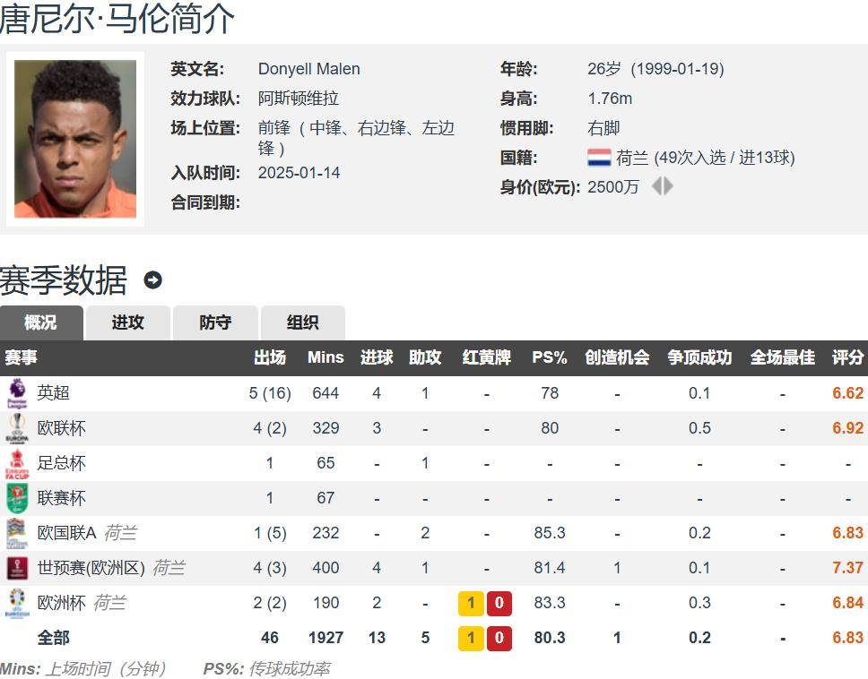 มาเลนเข้าร่วมทีมแอสตัน วิลล่าจากโบรุสเซีย ดอร์ทมุนด์ในเดือนมกราคม 2025 ด้วยค่าตัว 25 ล้านยูโร การขายเขาในครั้งนี้ถือเป็นการทำธุรกรรมที่ไม่กระทบต่อต้นทุนของสโมสร นักเตะได้พัฒนาฟอร์มการเล่นอย่างต่อเนื่องที่วิลล่าพาร์ค แต่ความปรารถนาที่จะย้ายไปร่วมทีมโรม่าทำให้สโมสรตัดสินใจปล่อยตัวเขาเพื่อคืนทุนการลงทุน