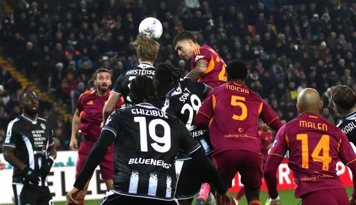 อย่างไรก็ตาม การแข่งขันดำเนินไปอย่างตรงกันข้ามกับการคาดการณ์ของผู้เชี่ยวชาญก่อนเกมอย่างสิ้นเชิง ตลอดครึ่งแรก โรม่าครองบอลได้ถึง 54% อย่างเหนือชั้น แต่กลับเล่นอย่างเชื่องช้าและขาดแรงบันดาลใจ ตลอด 45 นาทีแรก พวกเขาสามารถยิงตรงกรอบได้เพียง 3 ครั้งเท่านั้น โดยมีเพียง 1 ครั้งที่เข้ากรอบ ในทางตรงกันข้าม อูดิเนเซ่เลือกใช้แนวทางที่ตรงไปตรงมา ไม่ซับซ้อน สร้างความอันตรายได้มากกว่าด้วยการยิงตรงกรอบ 5 ครั้ง ในนาทีที่ 17 เคนาน เดวีส์ ของอูดิเนเซ่ได้รับใบเหลืองจากการประท้วงในจังหวะเกมรับ จากนั้นในนาทีที่ 34 โทมัส คริสเตนเซ่น ของทีมก็ถูกใบเหลืองเช่นกัน เหตุการณ์เหล่านี้สะท้อนให้เห็นภาพรวมว่าอูดิเนเซ่สามารถหยุดยั้งเกมรุกของโรมาได้อย่างมีประสิทธิภาพ ด้วยการเคลื่อนไหวที่กระตือรือร้นและการเล่นเกมรับที่ค่อนข้างดุดันเล็กน้อย
