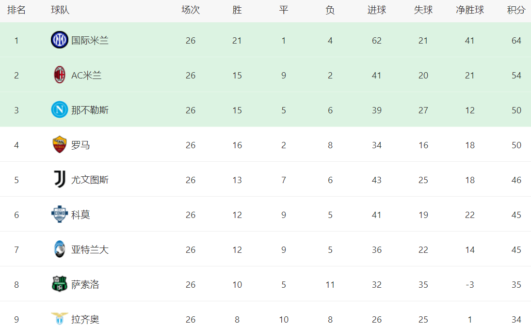 ในตารางลีก อินเตอร์ มิลาน ครองตำแหน่งผู้นำอย่างมั่นคง ด้วยชัยชนะ 21 นัด เสมอ 1 นัด และแพ้ 4 นัด ทำให้พวกเขามีคะแนนสะสม 64 คะแนน ครองตำแหน่งจ่าฝูงของตารางคะแนน แม้จะแพ้ไป แต่ เอซี มิลาน ยังคงอยู่ในอันดับสองด้วยคะแนน 54 คะแนน ตามหลังอินเตอร์ มิลานอยู่ 10 คะแนนเต็ม ตอนนี้ตำแหน่งแชมป์ดูเหมือนจะเกือบจะแน่นอนแล้ว นาโปลี อยู่ในอันดับสามด้วยคะแนน 50 คะแนนชัยชนะของโรม่าทำให้พวกเขามีคะแนนเท่ากับนาโปลีที่ 50 คะแนน ครองอันดับสี่ อย่างไรก็ตาม ด้วยสถิติการพบกันที่ด้อยกว่านาโปลี ทำให้พวกเขายังคงอยู่เบื้องหลังสโมสรจากทางใต้ ยูเวนตุสอยู่ในอันดับที่ห้าด้วย 46 คะแนน ตามหลังโรม่าอยู่สี่คะแนน โคโมและอตาลันต้าต่างมี 45 คะแนน ครองอันดับหกและเจ็ดตามลำดับ