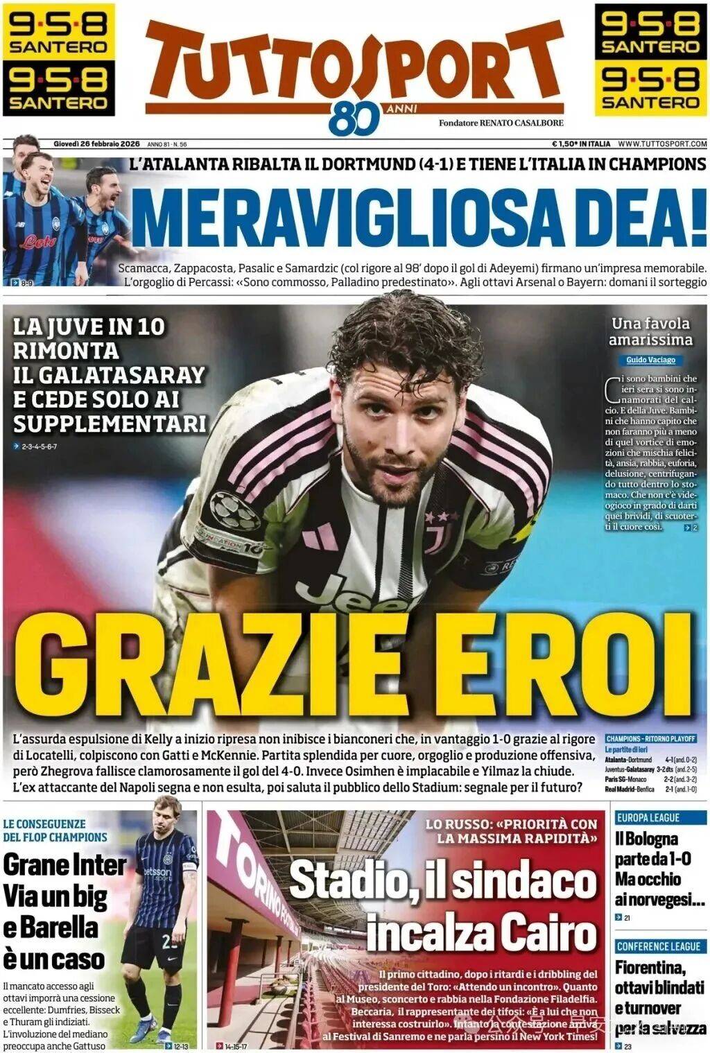 1. เทพธิดาแห่งอิตาลี ยูเวนตุส สมควรได้รับเสียงปรบมือแชมเปียนส์ลีก: ทีมอตาลันตาที่น่าทึ่ง, กับลูกทีมของสปัลเล็ตติที่เกือบจะสร้างปาฏิหาริย์ได้ขณะที่เหลือผู้เล่นเพียงสิบคน. ชัยชนะ 4-1 เหนือโบรุสเซีย ดอร์ทมุนด์, โดยประตูของซามาร์ดซิชทำให้พวกเขาได้ตำแหน่งในรอบ 16 ทีมสุดท้าย. ตอนนี้ต้องเผชิญหน้ากับบาเยิร์น มิวนิคหรืออาร์เซนอลในการจับสลากพรุ่งนี้. ทีมหญิงชราชนะกาลาตาซาราย 3-0 ภายในเก้าสิบนาที, แต่ใบแดงของเคลลี่ทำให้พวกเขาต้องเล่นน้อยกว่าเกือบตลอดการแข่งขัน, สุดท้ายพ่ายแพ้ 3-2 ในช่วงต่อเวลาพิเศษ.