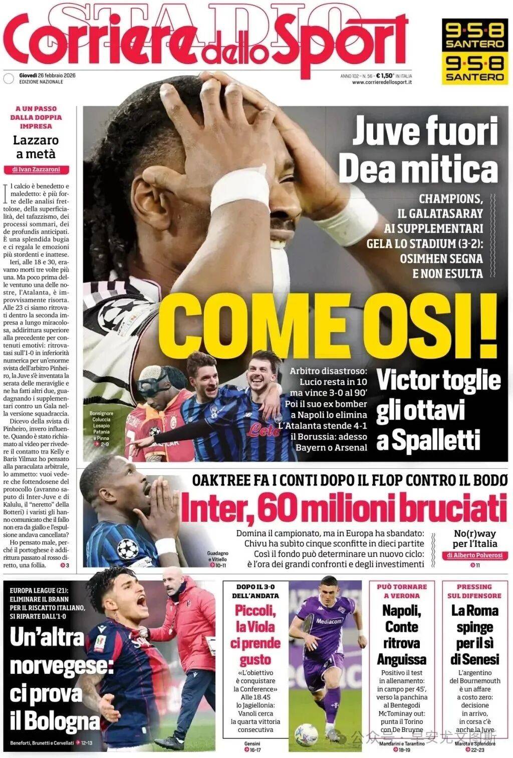 1. ยูเวนตุสตกรอบแล้ว เทพธิดาเล่นได้ยอดเยี่ยม ในแชมเปียนส์ลีก กาลาตาซารายแพ้ 2-3 ที่อัลลิอันซ์ อารีนา แต่ผ่านเข้ารอบไปได้ ขณะที่โอซิมเฮนทำประตูแต่ไม่ฉลอง วิคเตอร์คว้าตั๋วเข้ารอบ 16 ทีมสุดท้ายจากมือของสปัลเล็ตติ การตัดสินที่เลวร้าย: ลูซิโอโดนไล่ออกเหลือสิบคน แต่ชนะ 3-0 ภายใน 90 นาที แต่กลับถูกอดีตคู่ปรับจากนาโปลีเขี่ยตกรอบอตาลันต้าถล่มดอร์ทมุนด์ 4-1: ตอนนี้จะเจอกับบาเยิร์นหรืออาร์เซนอล