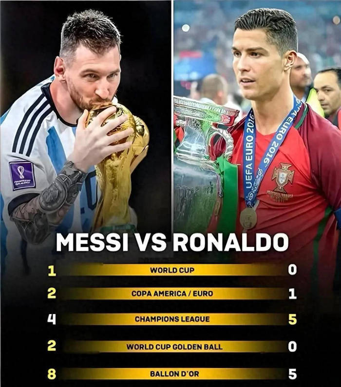 บัลลงดอร์: เมสซี่ 8 สมัย, โรนัลโด้ 5 สมัย. นักกีฬาชายยอดเยี่ยมแห่งปีของรางวัลลอเรอุสเวิลด์สปอร์ต: เมสซี่ 2 สมัย, โรนัลโด้ ไม่เคยได้. แชมป์ยูฟ่าแชมเปียนส์ลีก: โรนัลโด้ 5 สมัย, เมสซี่ 4 สมัย. ประตูในยูฟ่าแชมเปียนส์ลีก: โรนัลโด้ นำ 140 ประตู, เมสซี่ อันดับสอง 129 ประตู. บูททองคำยุโรป: เมสซี่ 6 สมัย, โรนัลโด้ 4 สมัย.