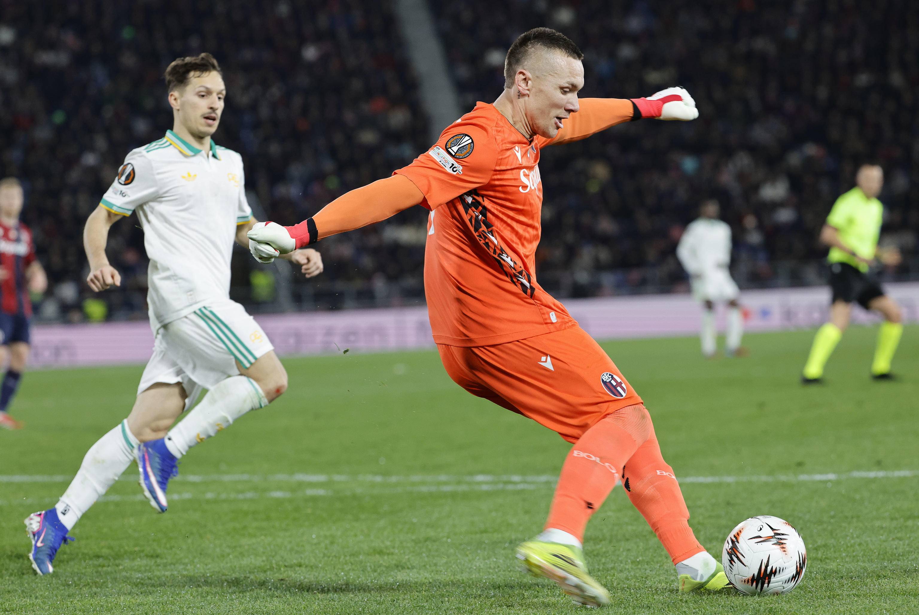 ผู้รักษาประตูโบโลญญา Skrupski (ขวา) เมื่อวันที่ 12 มีนาคม ในเกม สำนักข่าวซินหัว/OU XIN