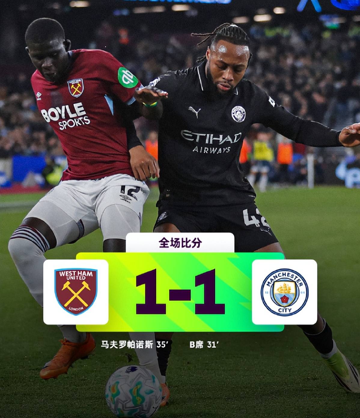 เมื่อมองย้อนกลับไปที่เกมนี้ ในนาทีที่ 32 การจ่ายบอลตรงของ Malmush เปิดแนวรับของ West Ham และ B-Seals ยิงข้ามผู้รักษาประตู Hermanson จากมุมเล็ก ๆ ในเขตโทษและทำคะแนนนำให้แมนเชสเตอร์ซิตี้ แต่เพียง 3 นาทีต่อมา โบเวนส่งบอลเข้าเขตโทษได้แม่น และ โบเวน ส่งบอลเข้าเขตโทษได้อย่างแม่นยำ แต่ นายดอน นารุมม่า อย่างฉับพลันแต่ไม่ทันได้สัมผัสบอล Mavro Panos คว้าโอกาสในการมุ่งหน้าไปและลูกบอลกระแทกที่ขอบล่างของคานประตูและกระดอนเข้าตาข่ายและคะแนนก็เท่ากันทันที
