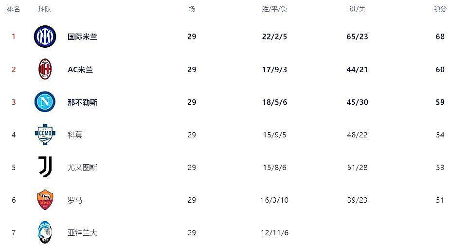 ตอนนี้อันดับนี้ อินเตอร์ มิลาน ยังคงเป็นคนแรก และเป็นชุดที่เสถียร มิลานเป็นอันดับสอง เนเปิลส์ที่สาม จากนั้น Cuomo ม้ามืดตัวนี้ก็ไปถึงอันดับที่สี่โดยตรงและเข้าสู่ Champions League! ยูเวนตุสที่ห้า, โรมที่หก นี้เป็นสิ่งที่ดีในช่วงครึ่งหลังของลีกใด ๆ ที่มีชีวิตชีวา