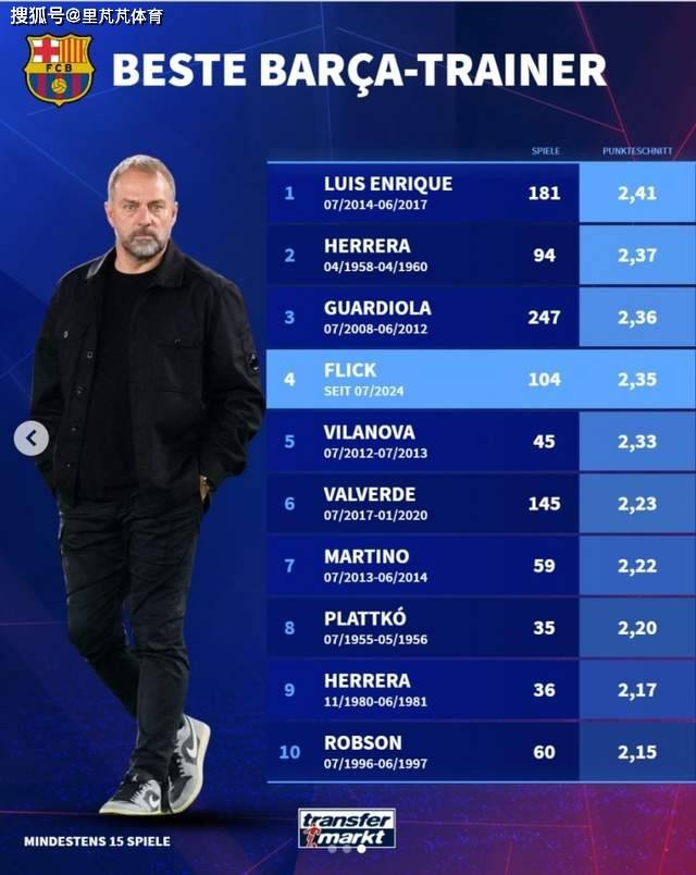 ตลาดการโอนย้ายของเยอรมันได้คะแนนเฉลี่ยของบาร์เซโลนาต่อเกม (อย่างน้อย 15 เกม) Enrique อยู่ในอันดับต้น ๆ ด้วย 2.41 คะแนนและ Herrera (2. 37 คะแนน) และ Guardiola (2. 36 คะแนน) อยู่ในอันดับที่สองหรือสาม โค้ชคนปัจจุบัน Frick มีโค้ช 104 เกม เฉลี่ย 2.35 แต้มต่อเกมและอยู่ในอันดับที่สี่ วิลาโนวา (2.33 แต้ม), บัลเบร์เด้ (2.23 แต้ม) และโค้ชชื่อดังคนอื่นๆ ก็เข้าสู่สิบอันดับแรกเช่นกัน