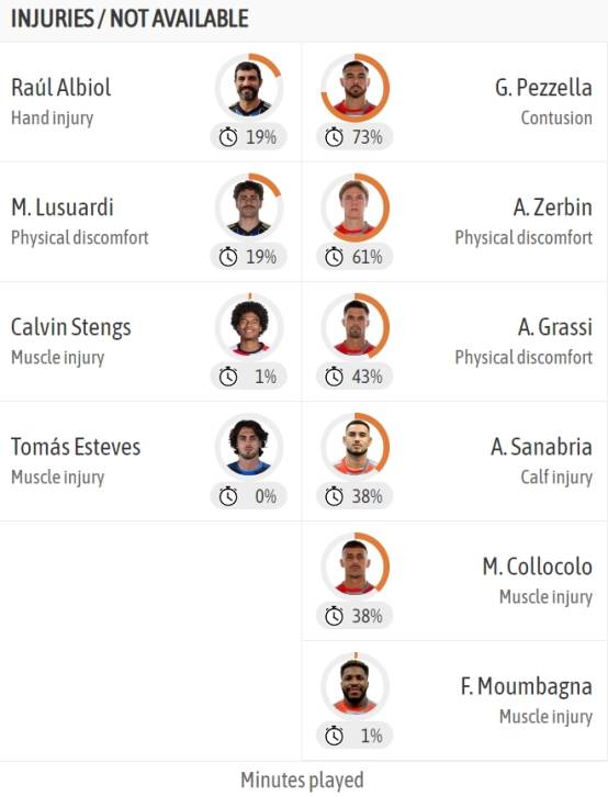 ทางด้านหน้า กองหน้าตัวกลางทีมชาติปารากวัย ซานาเบรีย ได้รับบาดเจ็บที่น่อง ทำให้ต้องพึ่งพา บอนัซโซลี และ วาร์ดี มากขึ้น โดยคนหลังซึ่งใกล้จะอายุ 40 ปี ได้ลงเป็นตัวจริงและเล่นครบ 90 นาทีในสี่นัดติดต่อกันแล้ว