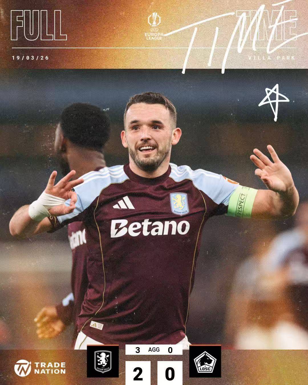รอบชิงชนะเลิศ Europa League 1/8 ในรอบที่สองของการแข่งขันทั้งหมดจะแข่งขันกัน และแต่ละคนก็มีความสุขและเศร้าโศกของตัวเอง ทั้งแอสตัน วิลล่า และน็อตติงแฮม ฟอเรสต์ ได้ก้าวเข้าสู่สองทีมพรีเมียร์ลีก แอสตัน วิลล่า เล่นในบ้านกับลีลล์ และเอาชนะลิล 2-0 ด้วยประตูของแม็คกินและลีออน เปเล่ แอสตัน วิลล่า ชนะ 1-0 ในรอบแรก แอสตัน วิลล่า จึงตกรอบลีลล์ด้วยคะแนนรวม 3-0 แอสตัน วิลล่า มูลค่ารวม 540 ล้านยูโร เป็นทีมเต็งที่จะคว้าแชมป์คว้าแชมป์สตรีคที่ชนะ 7 เกมในยูโรป้าลีกได้อย่างน่าทึ่ง