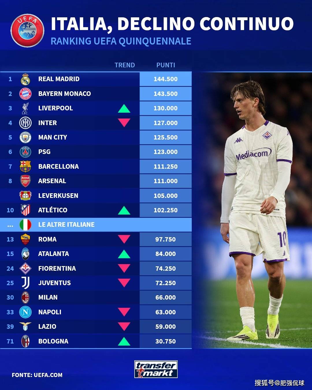 ปัจจุบันคะแนนยุโรปล่าสุดของอินเตอร์มิลานได้หลุดไปอยู่ในอันดับที่สี่และยังเป็นทีมเดียวในเซเรียอาใน 10 อันดับแรก โรมและแอตแลนต้ายังคงอยู่ใน 20 อันดับแรกในขณะที่ทีมอื่น ๆ ทั้งหมด 20 คน สิ่งนี้ยังทำให้การจัดอันดับลีกยูฟ่าในเซเรียอาสลิปจากอันดับที่สองในฤดูกาลที่แล้วเป็นอันดับที่ 5 ในฤดูกาลนี้และแซงหน้าบุนเดสลีกาและโปรตุเกสอย่างต่อเนื่องและคะแนนของลีกเอิงที่หกมีไม่มากและสี่แห่งแชมเปี้ยนส์ลีกถัดไปอาจไม่ได้รับการบันทึก!