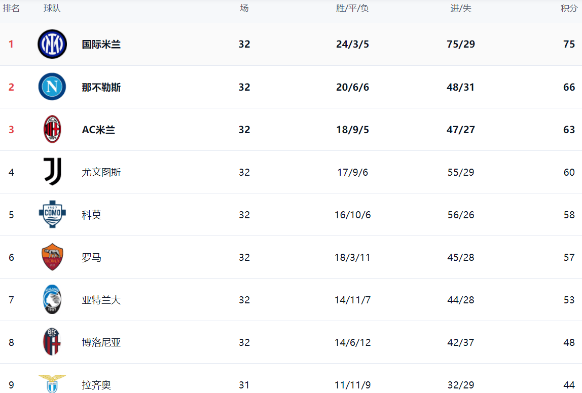 อินเตอร์ มิลาน นำหน้าในอันดับ อินเตอร์ มิลาน ชนะ 24 เสมอ 3 แพ้ 5 แต้ม และ 75 แต้ม ในรอบนี้ทั้งเนเปิลส์และเอซี มิลาน เสียแต้มทำให้อินเตอร์ มิลาน ได้เปรียบขยายตัวต่อไป เนเปิลส์รั้งอันดับสองด้วยคะแนน 66 แต้มตามหลังอินเตอร์ มิลาน 9 แต้ม เอซี มิลาน ทำได้เพียง 63 แต้ม อันดับสาม ยูเวนตุส ได้คะแนน 60 คะแนน อันดับที่ 4 หลังแพ้ Cuomo ยังได้คะแนน 58 คะแนน พลาด ยูเวนตุส อันดับที่ห้า โรมอยู่ในอันดับที่ 6 ด้วยคะแนน 57 อันดับที่ 7 คือแอตแลนต้าซึ่งทำคะแนนได้ 53 คะแนน
