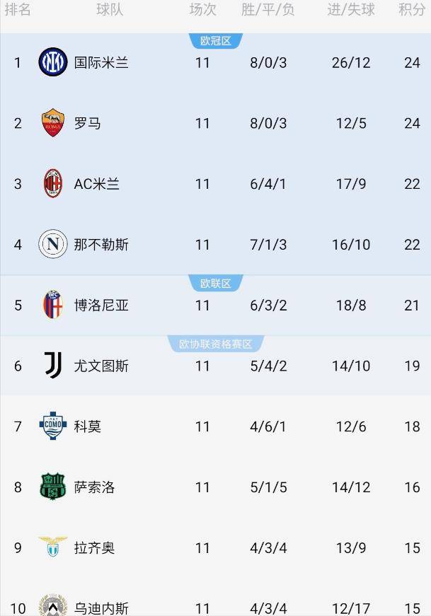 หลังจากการแข่งขันรอบนี้ อินเตอร์ มิลาน และ โรม่า มีคะแนนเท่ากันที่ 24 คะแนน โดยเนรัซซูรี่ครองตำแหน่งจ่าฝูงชั่วคราวเนื่องจากมีผลต่างประตูได้เสียที่ดีกว่า เอซี มิลาน และ นาโปลี ตามมาติดๆ ด้วยคะแนน 22 และ 21 คะแนนตามลำดับ ขณะที่ ยูเวนตุส อยู่อันดับที่ 6 ด้วยคะแนน 19 คะแนนการแข่งขันรอบที่ 12 ที่กำลังจะมาถึงนี้สัญญาว่าจะเต็มไปด้วยความดราม่า โดยศึกดาร์บี้แห่งเมืองมิลานจะเป็นตัวกำหนดผู้นำคนใหม่ของลีก โรม่า, นาโปลี และยูเวนตุส ก็ต้องเผชิญกับโปรแกรมสำคัญเช่นกัน ขณะที่การแข่งขันชิงแชมป์กัลโช่ เซเรีย อา กำลังเข้มข้นขึ้น ซึ่งถือเป็นทั้งความท้าทายและโอกาสสำหรับทุกทีมที่มีลุ้น