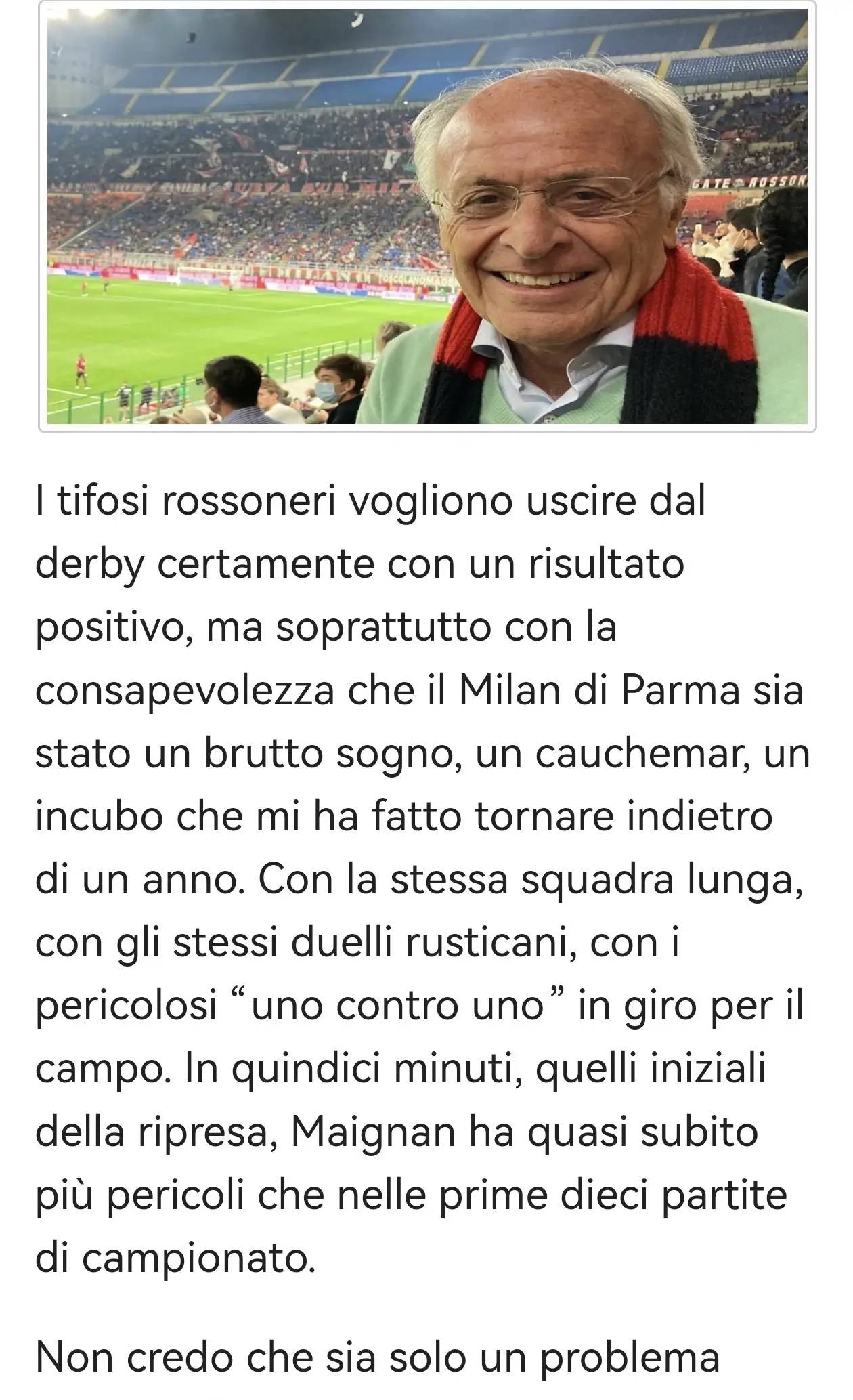 แฟนบอลเอซี มิลาน ต่างโหยหาชัยชนะในเกมดาร์บี้ แต่เหนือสิ่งอื่นใด พวกเขาปรารถนาอย่างยิ่งที่จะสลัดฝันร้ายจากเกมพ่ายแพ้ต่อปาร์ม่าออกไป—เกมที่ทำให้ทีมต้องถอยหลังไปหนึ่งปี ทั้งทีมดูเฉื่อยชา ขาดความแข็งแกร่งทางร่างกาย และเต็มไปด้วยจุดอ่อนในการเผชิญหน้าตัวต่อตัวตลอดทั้งเกม เพียงแค่ 15 นาทีแรกของครึ่งหลัง ไมญ็องต้องเผชิญกับอันตรายมากกว่าที่เขาเจอใน 10 นัดลีกก่อนหน้านี้รวมกันเสียอีก