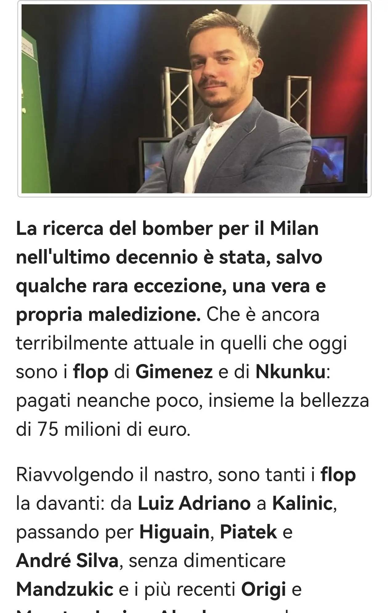 นักข่าวชื่อดังแห่งเซเรียอา: มิลานเป็นทีมเดียวในลีกที่ไม่มีศูนย์หน้าตัวเป้าทำประตู; ในทศวรรษที่ผ่านมา มีเพียงอิบราฮิโมวิชและชิรูด์เท่านั้นที่สามารถถือเป็นการเซ็นสัญญาที่ประสบความสำเร็จในแนวรุกของพวกเขา_Jiménez_Roma