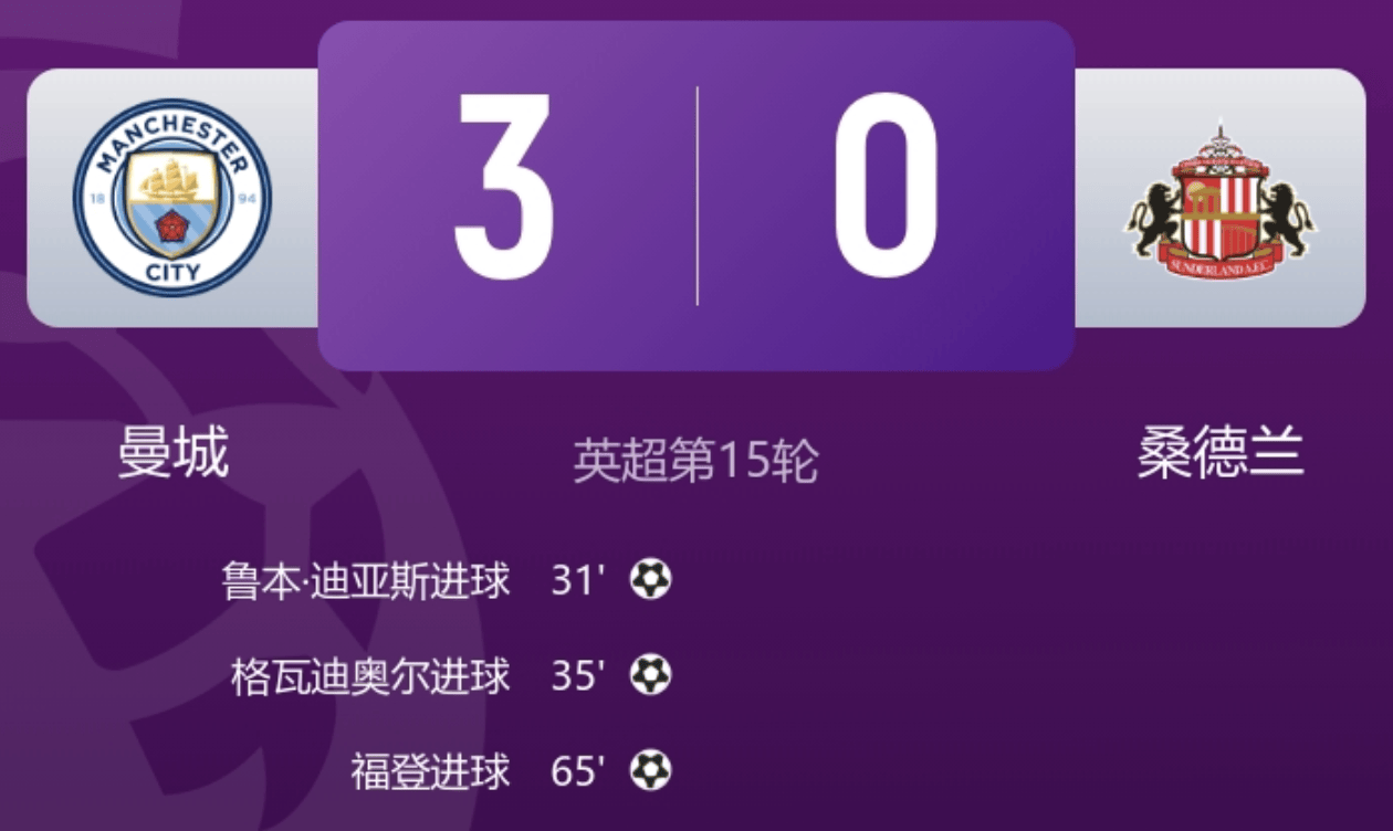 เวลา 23:00 น. ของวันที่ 6 ธันวาคม แมนเชสเตอร์ ซิตี้ เปิดบ้านต้อนรับการมาเยือนของซันเดอร์แลนด์ที่สนามเอติฮัด สเตเดียม ในรอบที่ 15 ของพรีเมียร์ลีก ครึ่งแรก รูเบน ดิอาส ยิงลูกกระหน่ำที่เปลี่ยนทิศทางจากผู้เล่นฝ่ายตรงข้ามเข้าประตูไป ขณะที่ฟิล โฟเดน ทำแอสซิสต์ให้โจเอา กวาร์ดิโอล โหม่งทำประตูในครึ่งหลัง ดูกูยิงชนเสา ดอนนารุมมาปฏิเสธโอกาสยิงประตูแบบตัวต่อตัว ซาก้าตีกรอบไม้ และเชอร์กี้ทำแอสซิสต์ด้วยการยิงหลังเท้าให้โฟเดนโหม่งทำประตู จบเกม: แมนเชสเตอร์ ซิตี้ 3-0 ซันเดอร์แลนด์ หลังจบเกมนี้ แมนเชสเตอร์ ซิตี้ ขยับขึ้นสู่อันดับสองด้วย 31 คะแนน ตามหลังจ่าฝูง อาร์เซนอล 2 คะแนน ส่วนซันเดอร์แลนด์ยังคงอยู่อันดับ 7 ด้วย 23 คะแนนบทความวันที่ 6 ธันวาคมทำนายผลการแข่งขันของแมนเชสเตอร์ ซิตี้ได้อย่างถูกต้อง โดยทำนายว่าแมนเชสเตอร์ ซิตี้จะชนะขาดลอยด้วยสกอร์ 3-0รายชื่อผู้เล่นตัวจริงของแมนเชสเตอร์ ซิตี้:จานลุยจิ ดอนนารุมมา; มาเธอุส นูเนส, รูเบน ดิอาส, กวาร์ดิโอล, โอไรลี่; นิโก้ กอนซาเลซ, แบร์นาร์โด ซิลวา, โฟเดน; เชอร์กี, ฮาลันด์, โดกุ