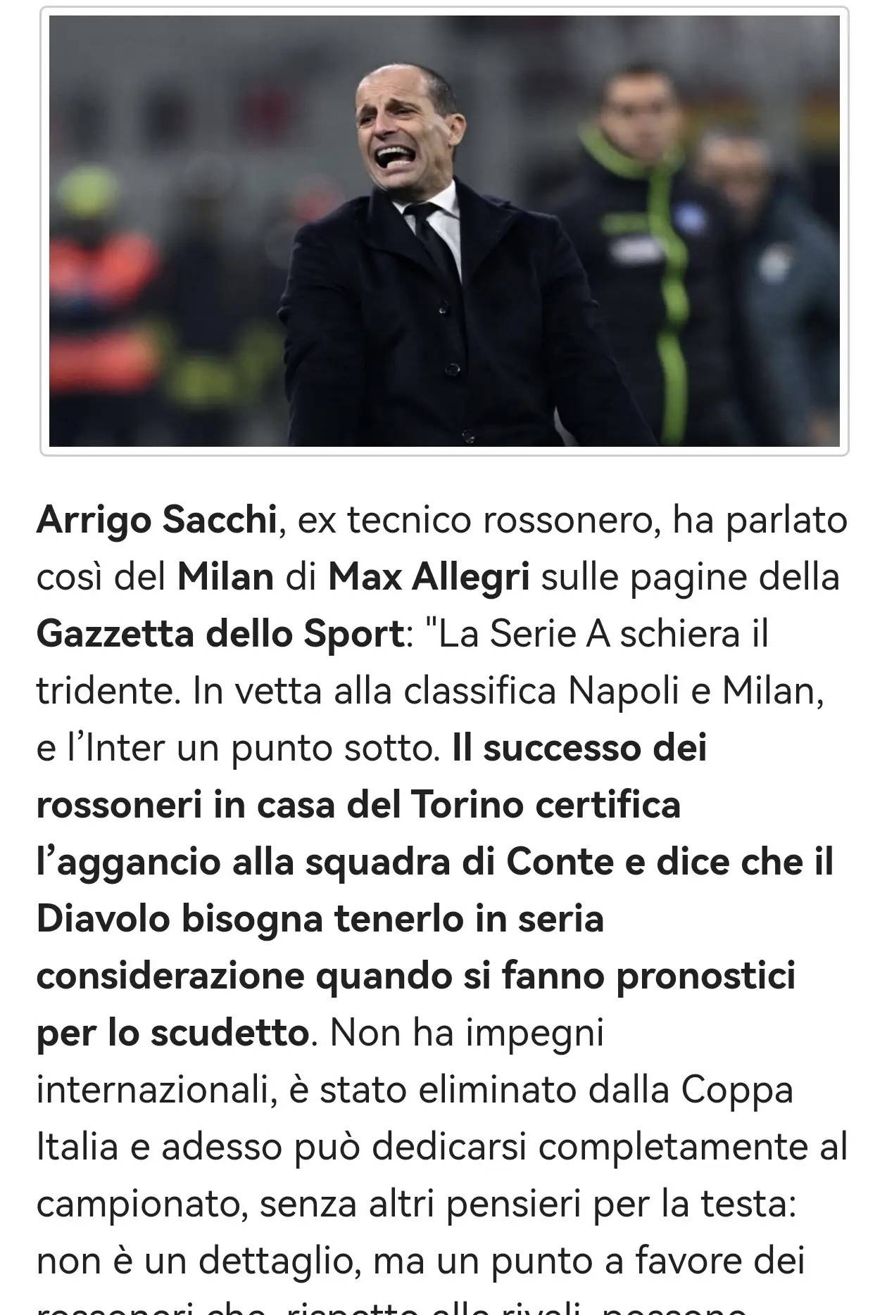 อดีตผู้จัดการทีมเอซี มิลาน อาร์ริโก ซาคชี่ ได้ให้คำประเมินเกี่ยวกับทีมของ มัสซิมิเลียโน อัลเลกรี ในคอลัมน์ของเขาสำหรับ La Gazzetta dello Sport: