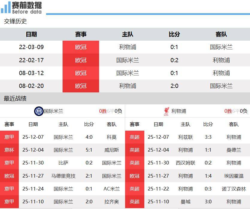 เวลา 04:00 น. ตามเวลาปักกิ่ง วันที่ 10 ธันวาคม อินเตอร์ มิลาน เปิดบ้านรับการมาเยือนของลิเวอร์พูล ในนัดที่ 6 ของรอบแบ่งกลุ่มยูฟ่า แชมเปียนส์ลีก