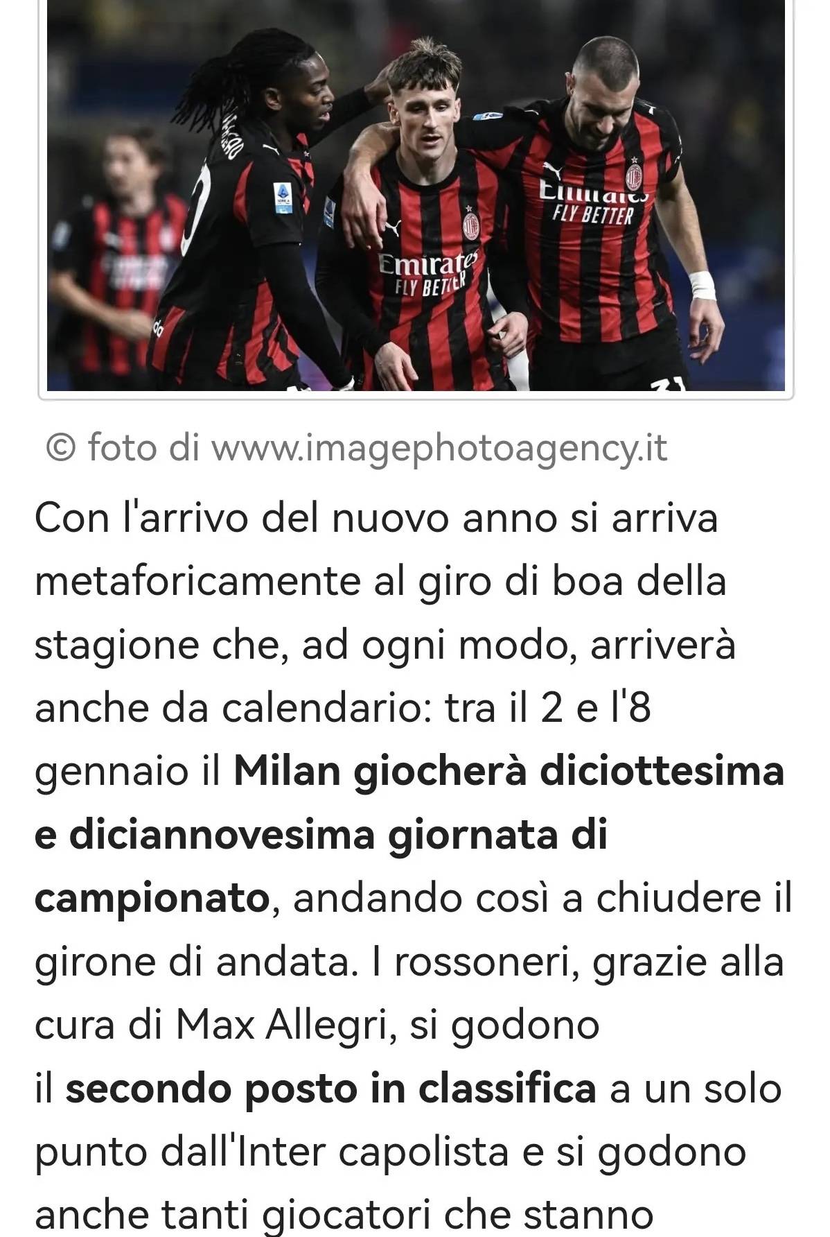 เมื่อปีใหม่ใกล้เข้ามา ฤดูกาลได้เข้าสู่ช่วงพักกลางฤดูกาลที่เป็นสัญลักษณ์แล้ว โดยการแข่งขันครึ่งแรกของแคมเปญกำลังจะสิ้นสุดลง: มิลานจะลงแข่งขันในเซเรีย อา นัดที่ 18 และ 19 ระหว่างวันที่ 2 ถึง 8 มกราคม ซึ่งจะทำให้การแข่งขันครึ่งแรกของฤดูกาลลีกสิ้นสุดลงภายใต้การนำของอัลเลกรี ทีมรอสโซเนรียังคงครองตำแหน่งที่สองอย่างมั่นคง โดยมีคะแนนตามหลังผู้นำอย่างอินเตอร์เพียงหนึ่งแต้ม ผู้เล่นหลายคนได้เปลี่ยนแปลงผลงานของพวกเขาอย่างสิ้นเชิง กลายเป็นผู้เล่นที่มีความสำคัญต่อชัยชนะของทีม และแสดงให้เห็นถึงการปรับปรุงคุณภาพของฟอร์มการเล่นเมื่อเทียบกับช่วงก่อนหน้านี้