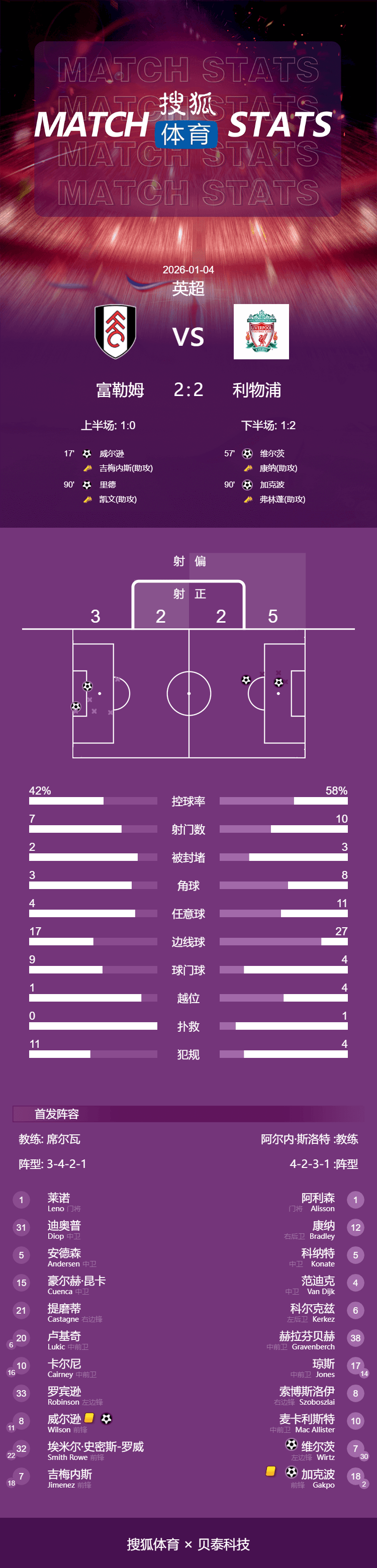เวลา 23:15 น. ตามเวลาปักกิ่ง วันที่ 4 มกราคม การแข่งขันพรีเมียร์ลีกฤดูกาล 2026-27 รอบที่ 20 ยังคงดำเนินต่อไป โดยลิเวอร์พูลเสมอกับฟูแล่ม 2-2 ที่สนามเครเวนค็อตเทจ ซึ่งนับเป็นการเสมอสองนัดติดต่อกันของพวกเขา แต่ยังคงไม่แพ้ใครใน 8 นัด และครองอันดับ 4 ในตารางพรีเมียร์ลีกอดีตนักเตะลิเวอร์พูล วิลสัน เปิดสกอร์ให้ฟูแล่มในนาทีที่ 17. วิร์ตซ์ ตีเสมอด้วยประตูที่มีข้อโต้แย้งในนาทีที่ 57. กัคโป พา ลิเวอร์พูล ขึ้นนำ 2-1 ในนาทีที่ 4 ของเวลาทดเจ็บ แต่รีด ตีเสมอด้วยประตูสุดสวยในนาทีที่ 7 ของเวลาทดเจ็บ.นอกจากนี้ กัคโป, แม็ค อัลลิสเตอร์ และวิลสัน ต่างก็ยิงชนเสาหรือคานประตูคนละครั้ง ขณะที่กัคโปยังมีอีกหนึ่งประตูที่ถูกปฏิเสธเนื่องจากล้ำหน้า ฟูแล่มยังคงไร้พ่ายในห้าเกมติดต่อกันและรั้งอันดับ 11 ของตาราง