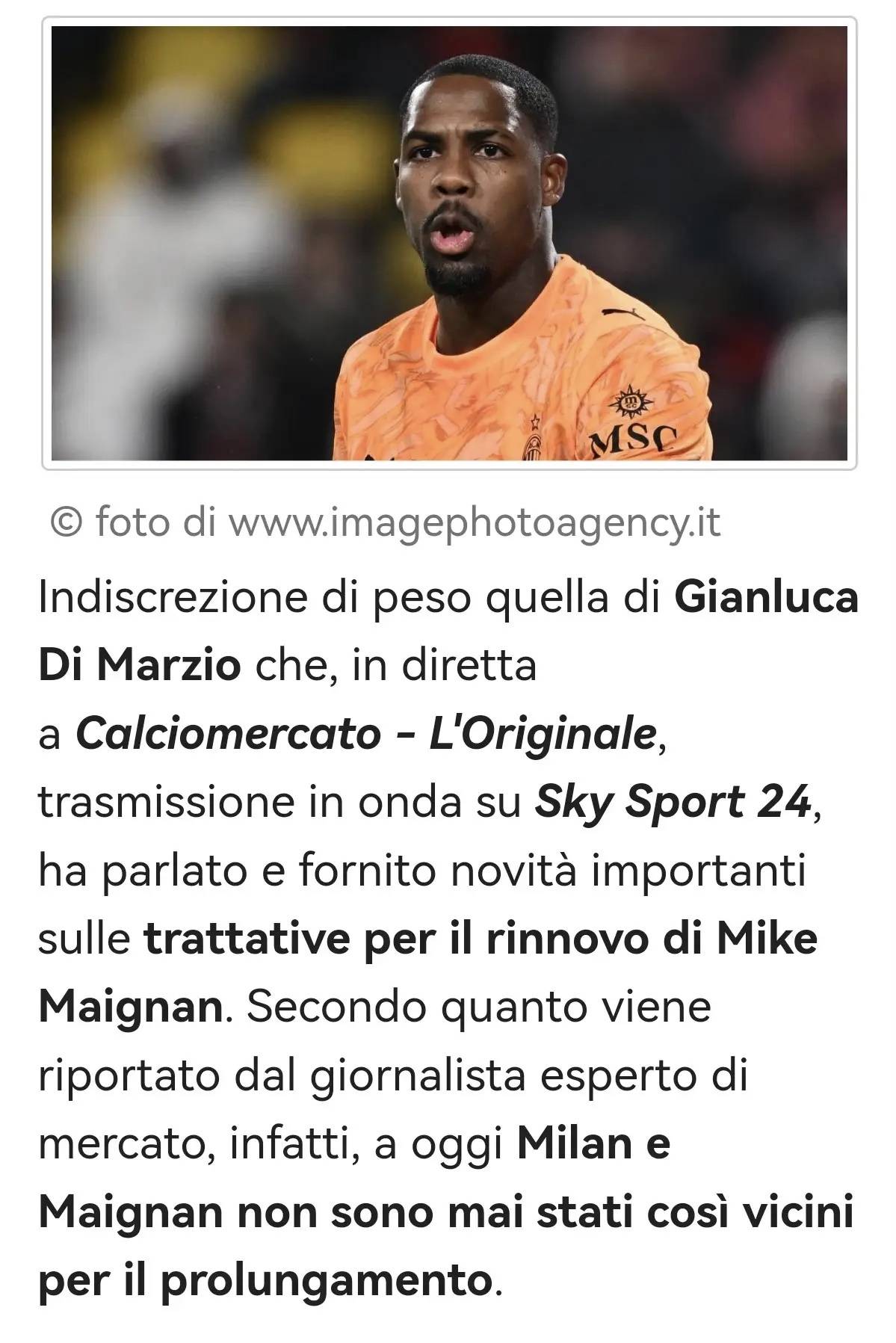 ด้านล่างนี้คือความคิดเห็นของ Gianluca Di Marzio เกี่ยวกับการต่อสัญญาระหว่าง Mike Maignan กับ Milan: "การต่อสัญญาระหว่าง Maignan กับ Milan ไม่เคยใกล้เคียงมากเท่านี้มาก่อน: ช่องว่างระหว่างทั้งสองฝ่ายไม่เคยแคบลงเท่านี้มาก่อน การเจรจาในช่วงไม่กี่ชั่วโมงที่ผ่านมาได้มีความคืบหน้าในเชิงบวกอย่างมาก และตอนนี้เราสามารถเปิดเผยรายละเอียดของข้อตกลงใหม่ได้แล้ว: สัญญาจะมีระยะเวลาจนถึงปี 2031 โดยมีเงินเดือนเทียบเท่ากับ Leão"การเจรจาจะดำเนินต่อไปในอีกไม่กี่วันข้างหน้าเพื่อสรุปข้อตกลงให้เสร็จสมบูรณ์