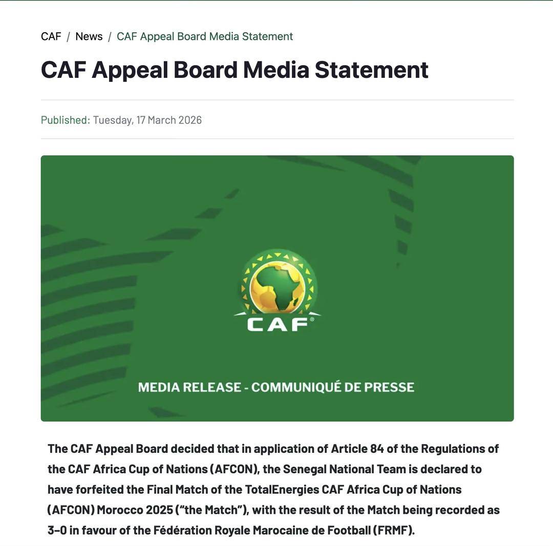 ในตอนเย็นของวันที่ 18 มกราคม เวลาท้องถิ่นในโมร็อกโก ในการพลิกผันของรอบชิงชนะเลิศแอฟริกัน คัพ 2025 เซเนกัลเอาชนะโมร็อกโก 1-0 เพื่อคว้าแชมป์ แต่เรื่องนี้ยังไม่จบ ในตอนเช้าของวันที่ 18 มีนาคม ตามเวลาปักกิ่ง สหพันธ์ฟุตบอลแอฟริกันประกาศบนเว็บไซต์อย่างเป็นทางการว่าหลังจากสมาคมฟุตบอลโมร็อกโกยื่นอุทธรณ์คณะกรรมการอุทธรณ์ที่ไม่ใช่ FFA ตัดสินว่าทีมชาติเซเนกัลถูกตัดสินให้งดออกจากเกมและผลคือชัยชนะ 3-0 ในโมร็อกโก