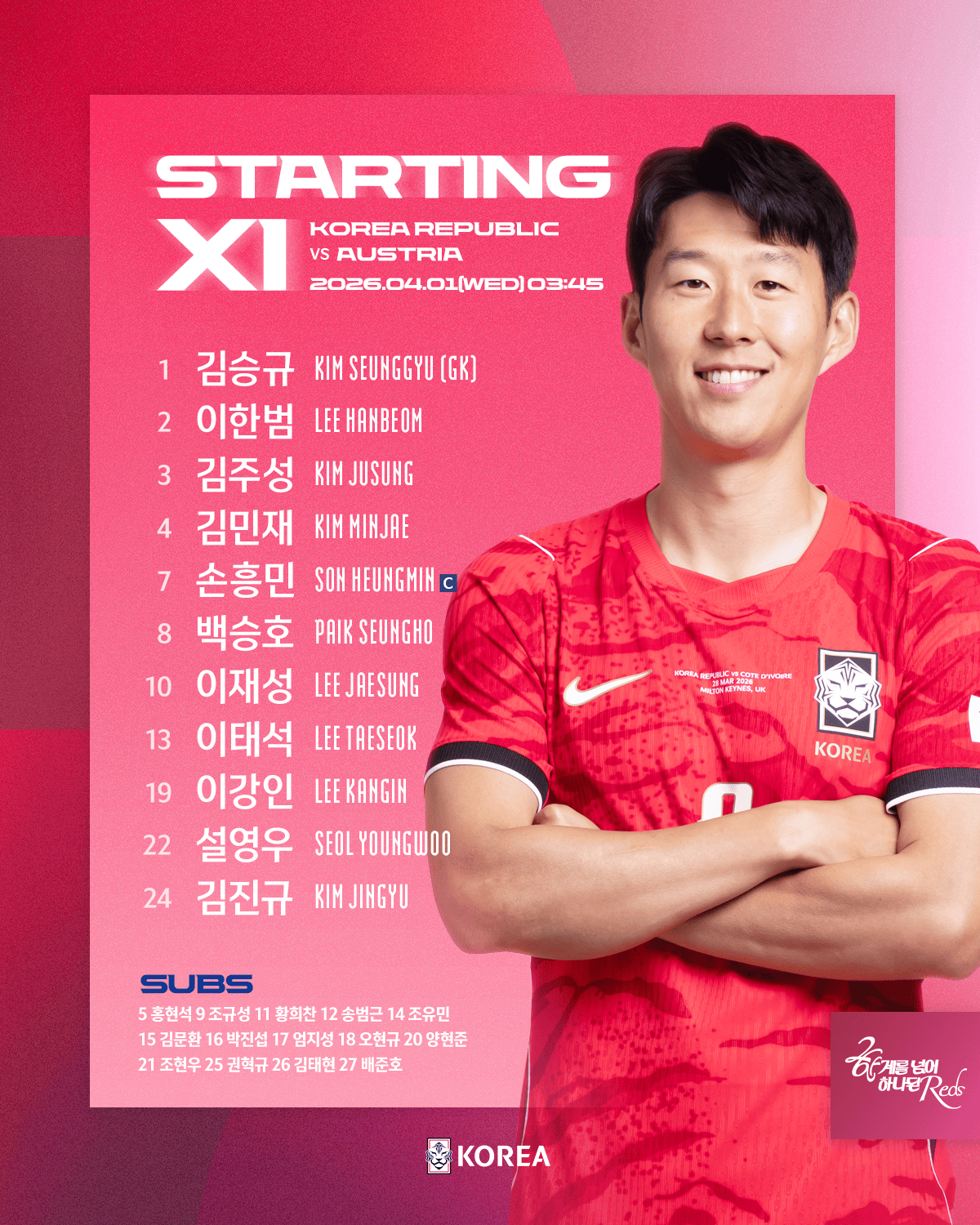 ถึง Côte d'Ivoire: 343-son Xingmin ออกจากบัลลังก์ในฐานะปีกซ้าย ไปออสเตรีย: 3421-son Heung-min เป็นศูนย์เดียว