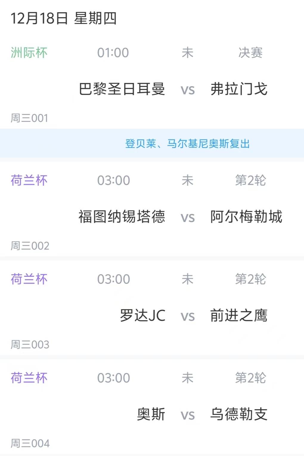 ไฮไลท์ของคืนนี้ประกอบด้วยการแข่งขันสำคัญเจ็ดรายการ นัดชิงชนะเลิศอินเตอร์คอนติเนนตัลคัพ ปารีส แซงต์-แชร์กแมง จะพบกับ ฟลาเมงโก้ – เกมที่ทั้งสองทีมจะให้ความสำคัญอย่างสูงสุด เนื่องจากสถานะของการแข่งขันในฐานะแชมป์โลก ถ้วย EFL ได้เข้าสู่รอบก่อนรองชนะเลิศแล้ว โดยผู้ชนะจะได้เข้าสู่รอบรองชนะเลิศ แม้ว่าทีมชั้นนำอาจมีการหมุนเวียนผู้เล่น แต่พวกเขาจะไม่ละเลยการแข่งขันนี้โดยสิ้นเชิง เมื่อเปรียบเทียบกันแล้ว ถ้วยดัตช์มีความเป็นไปได้สูงที่สุดที่จะเกิดการพลิกล็อก เนื่องจากเป็นเพียงรอบที่สองเท่านั้น